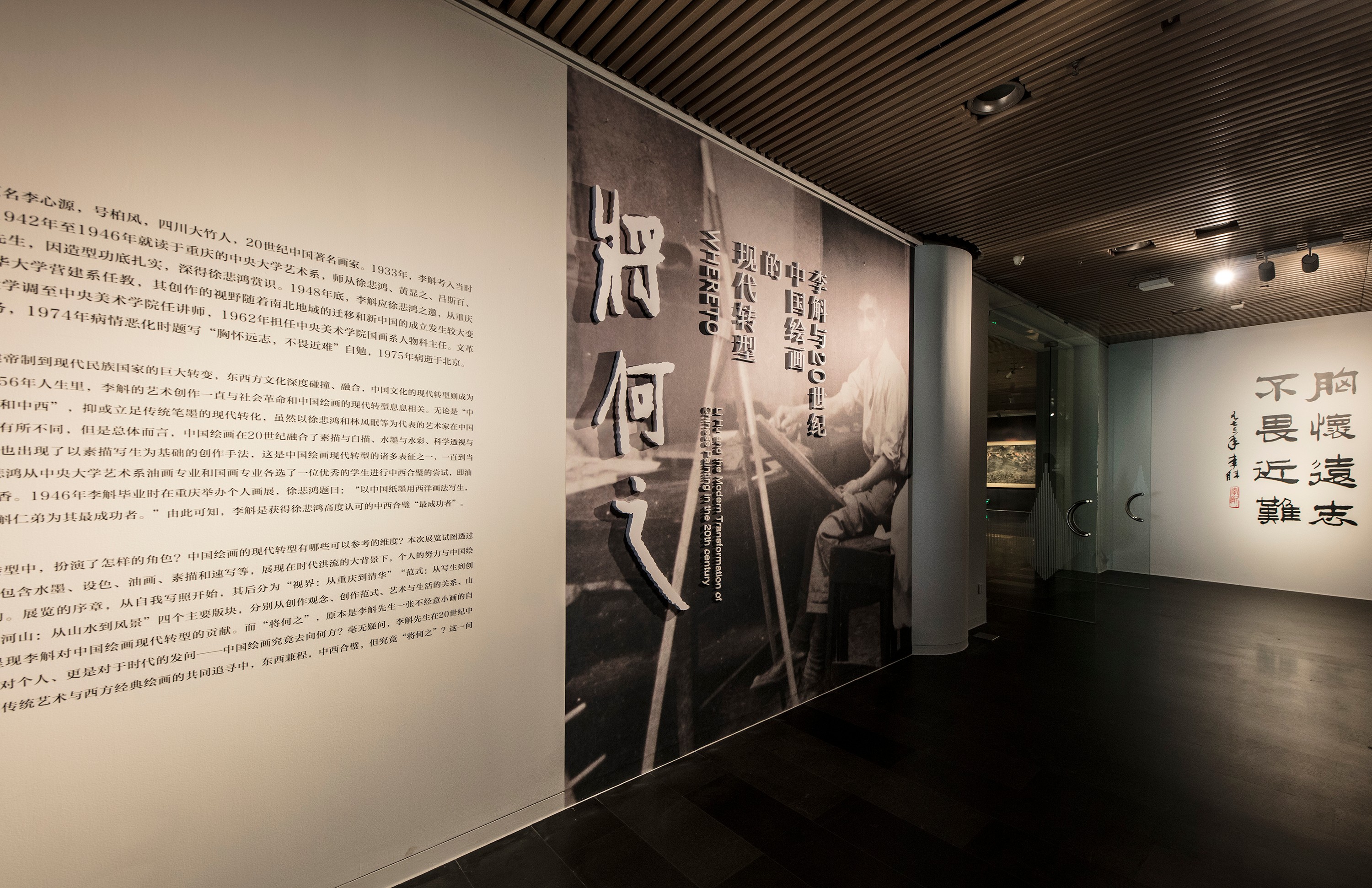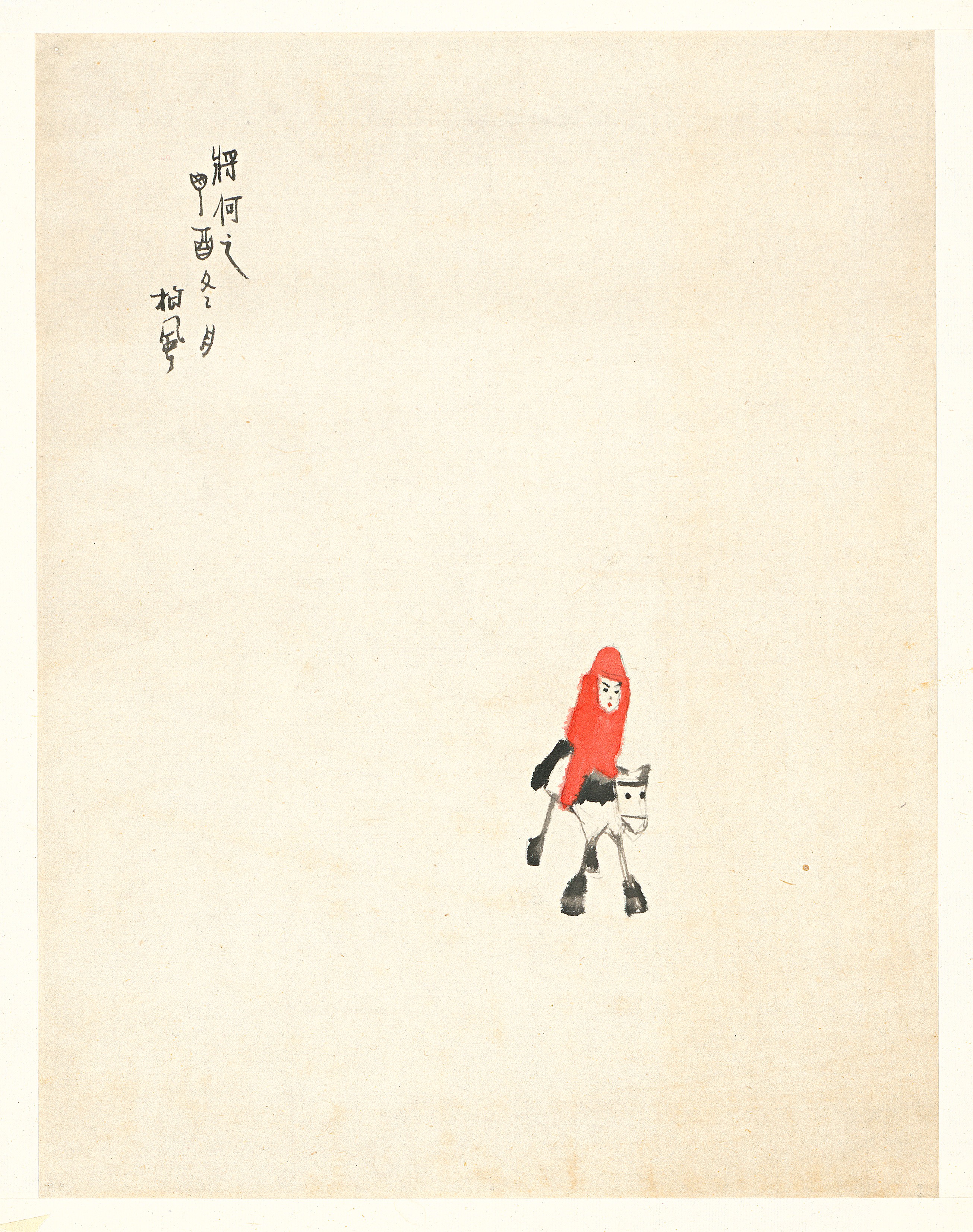 本次展览的主题“将何之”,是李斛一张小画的标题。走进展厅,作品《将何之》摆在最显眼的位置,在一片空白的画面中,右下方画着一个着红衣、骑瘦马的小人,神情惴惴、如履薄冰。讲解员解释:“这也是20世纪中国绘画现代转型诸多问题的一种隐喻。中国绘画如何实现现代转换?现代转型形成了哪些范式?又有哪些维度?这些问题,李斛用作品给了我们一种回应。”