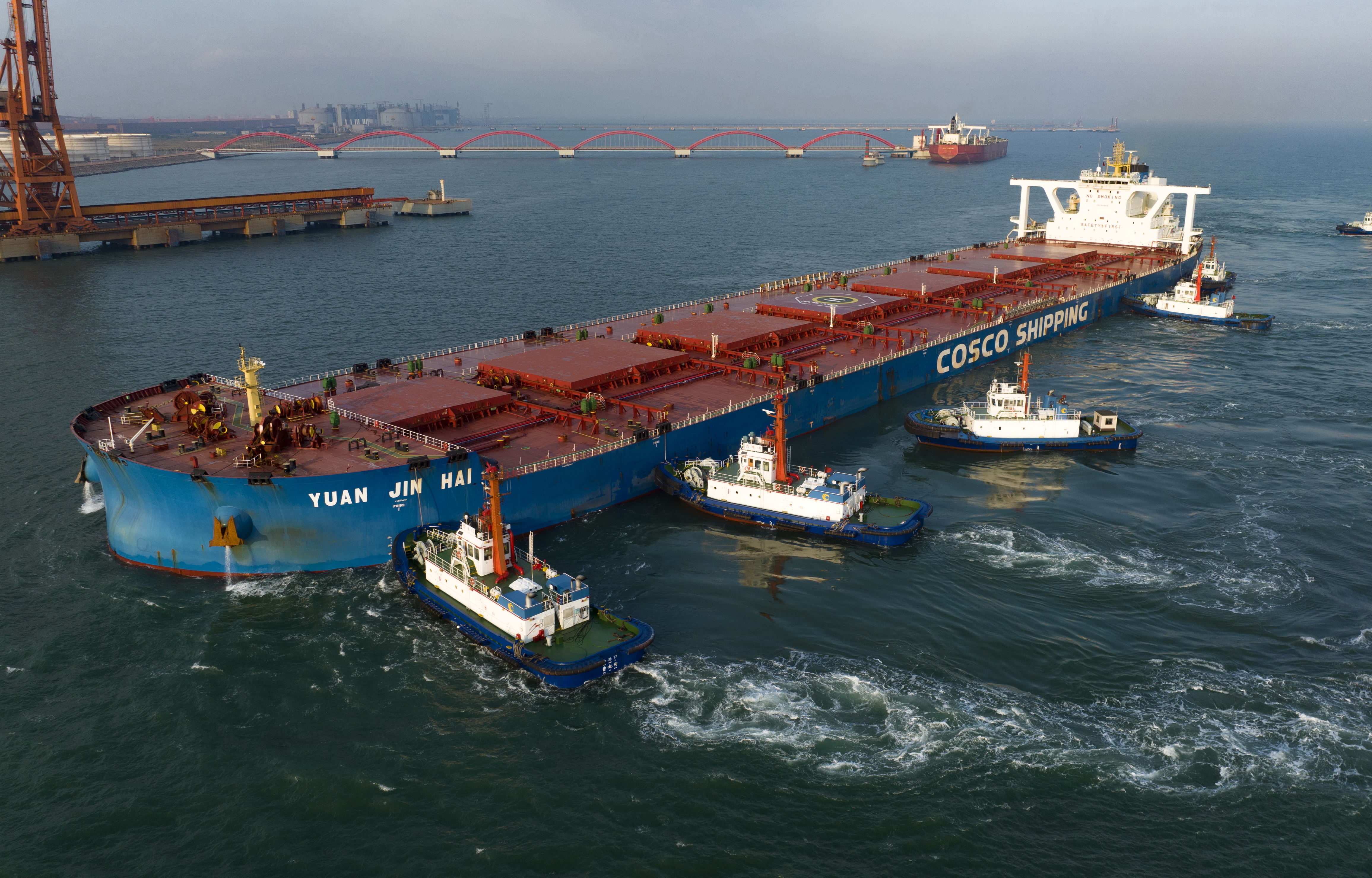 一艘轮船在拖轮的协助下向河北港口集团唐山港曹妃甸港区矿石码头靠泊(2022年9月10日摄,无人机照片)。新华社记者 杨世尧 摄