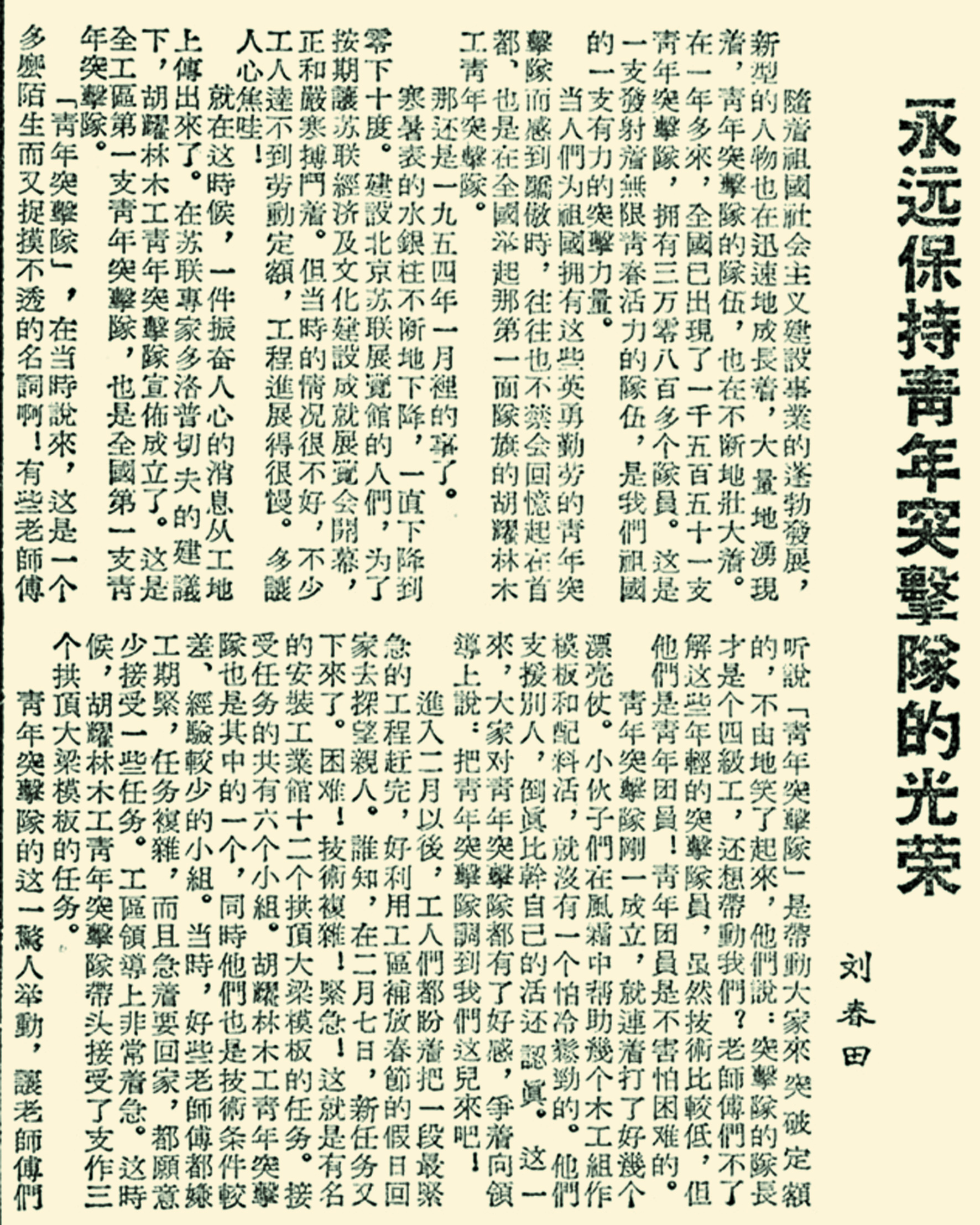 青年突击队这个响亮的名字最早出现于1954年。那年1月,气温低至零下10℃,北京苏联展览馆(现为北京展览馆)的建设正如火如荼。但是,当时工程进展比较慢,不少工人达不到劳动定额。在苏联专家的建议下,工地成立了由18位青年团员组成的全国第一支青年突击队——“胡耀林木工青年突击队”。
