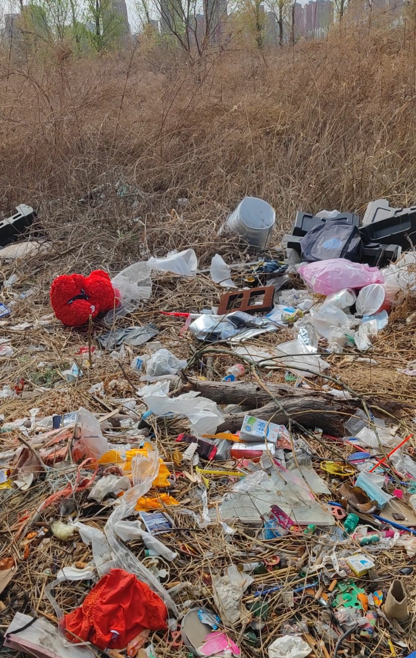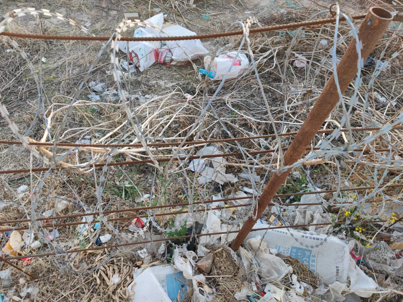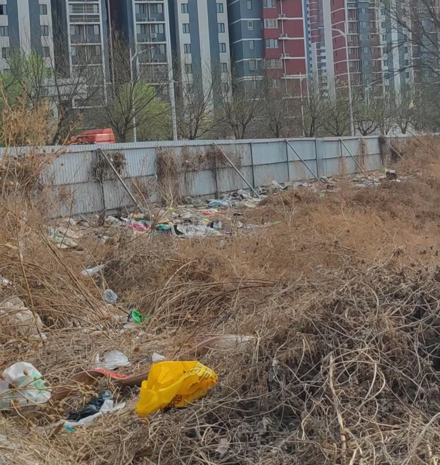 太平西三路沿途有次渠嘉园八区、次渠嘉园五区等小区,该道路目前是一条断头路,最北侧是一片空地。道路西侧人行便道的旁边有一排蓝色围挡,再往西同样是一片空地,里面有大片的枯草。记者近日探访时,透过围挡的缺口向里面望去,里面的景象令人非常吃惊。围挡的背后全都是成堆的垃圾,除了塑料袋、饮料瓶等各种生活垃圾,还有不少废弃的大件垃圾,倒伏在枯草丛中。垃圾倾倒的方向与围挡的走向相同,绵延几十米长。