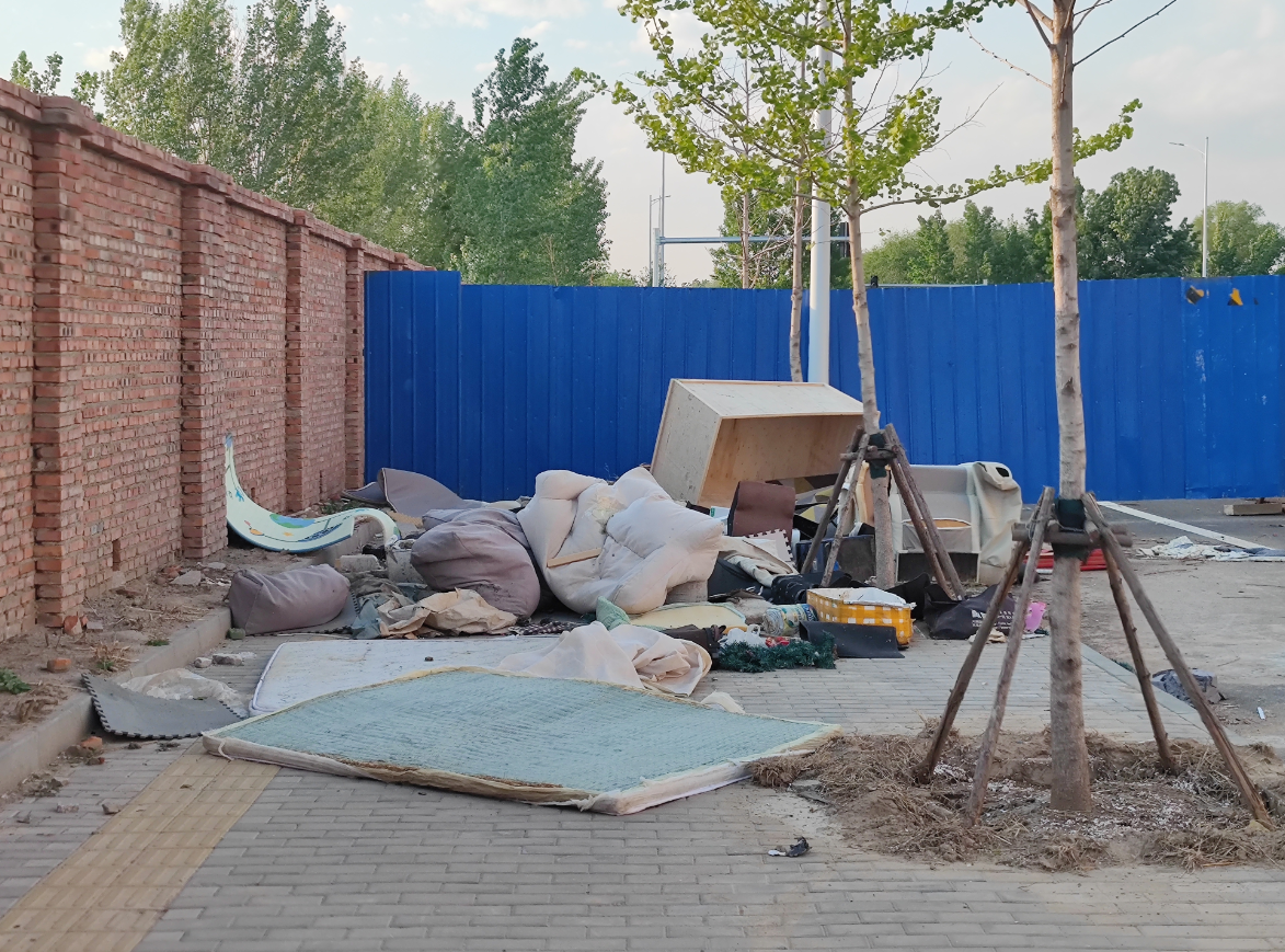 继续向北走,一道蓝色围挡拦住了去路,道路在这里成为了断头路。围挡西南侧人行便道的角落里,很多废弃的床垫、被褥、木柜、沙发等大件家具用品,被人随意丢弃在了这里。