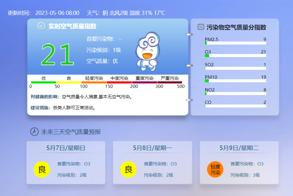 据北京市生态环境监测中心发布的5月6日8:00实时空气质量指数,目前,本市污染级别为1级,空气质量为优。