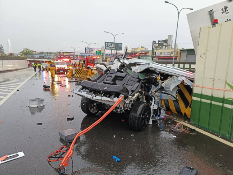 特斯拉Model Y撞上水泥护栏,车体毁损。图自台湾“中央社”