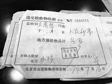 站柜台的窍门,“全盛”时期的故事,盖楼时的记忆……桩桩件件都是这次征集令要收集的内容。从4月20日发出征集令至今,商场已经收到老故事、照片、实物30余件。其中,最特殊的当属一叠微微泛黄、保存完整的送交捡拾物收据,足有二十多张。展开其中一张,只见上面写着:“兹收到王庆华同志捡拾物品人民币三分。”底下还有西单商场派出所的公章。