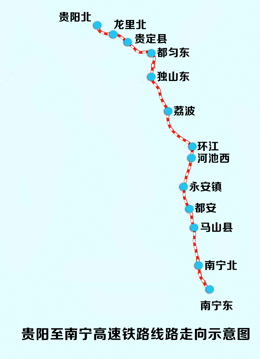 贵南高铁是我国“八纵八横”高速铁路网中包头至海口通道的重要组成部分,设计时速350公里,正线全长482公里。线路北起贵州贵阳,向南至广西南宁,全线设贵阳北、龙里北、贵定县、都匀东、独山东、荔波、环江、河池西、永安镇、都安、马山县、南宁北、南宁东等车站。