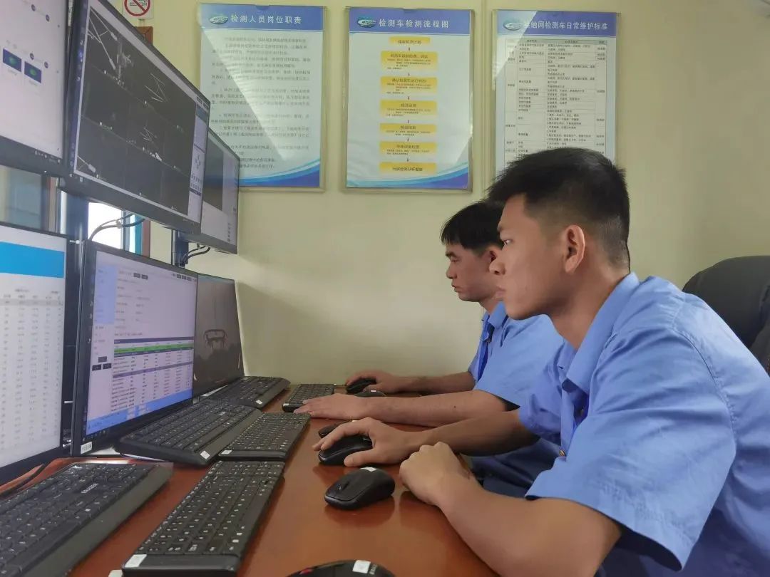 检测车开上贵南高铁正线后,一路平稳运行,桌面上杯水不摇;举目远眺,青山连绵,草木葱茏。在检测车内,电脑一字排开,一项项数据、一条条曲线牵动着所有检测人员的心。