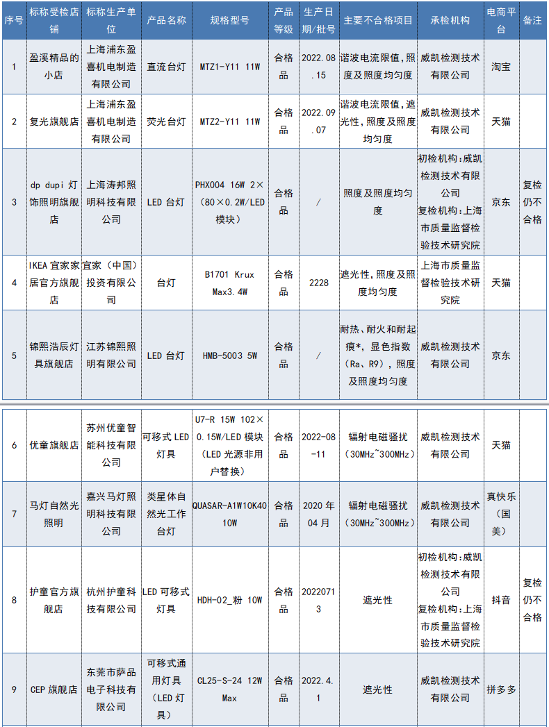 结构(平稳度)项目不合格的原因主要是,读写台灯底盘太轻,不能有效防止倾倒;耐热、耐火和耐起痕项目不合格的原因主要是,读写台灯选用的绝缘材料无法阻燃。