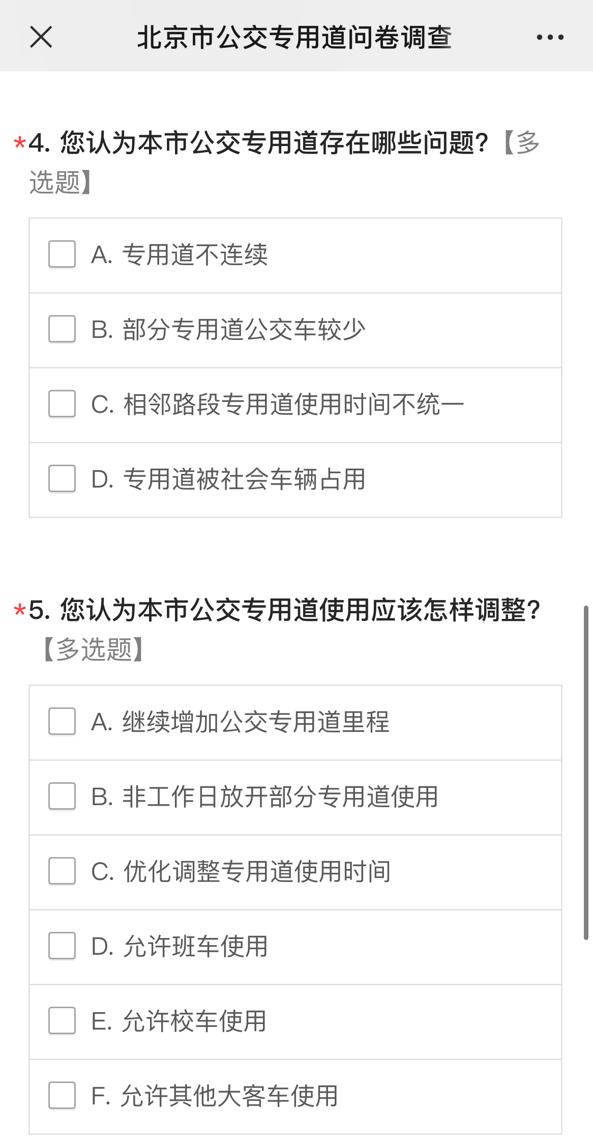 比如,一道多选题中问道,“您认为北京市公交专用道存在哪些问题?”,市民可在“专用道不连续”“部分专用道公交车较少”“相邻路段专用道使用时间不统一”“专用道被社会车辆占用”四个选项中选择。