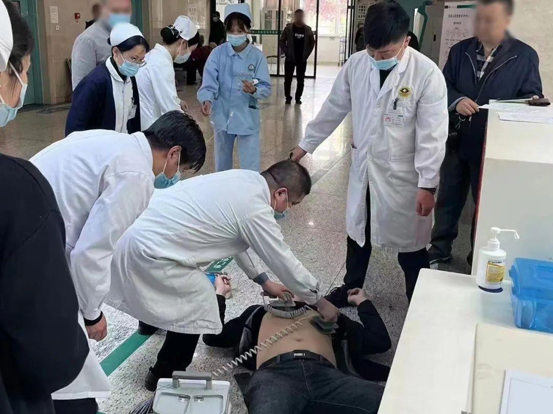 主治医师刘延男立即给予患者心脏按压,分诊护士孙晓丽协助患者平卧,同时开放呼吸道,抢救室护士郭同超立即建立静脉通道,闻声赶来的心律失常病区主任谢善冰和急诊科副主任孟祥凯立即携除颤仪到达现场,紧急评估后给予除颤。