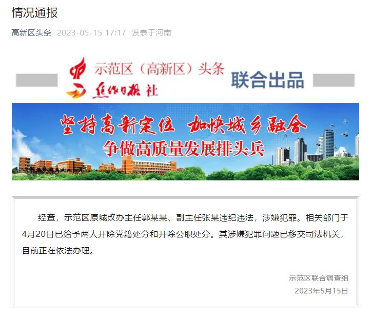 经查,示范区原城改办主任郭某某、副主任张某违纪违法,涉嫌犯罪。相关部门于4月20日已给予两人开除党籍处分和开除公职处分。其涉嫌犯罪问题已移交司法机关,目前正在依法办理。