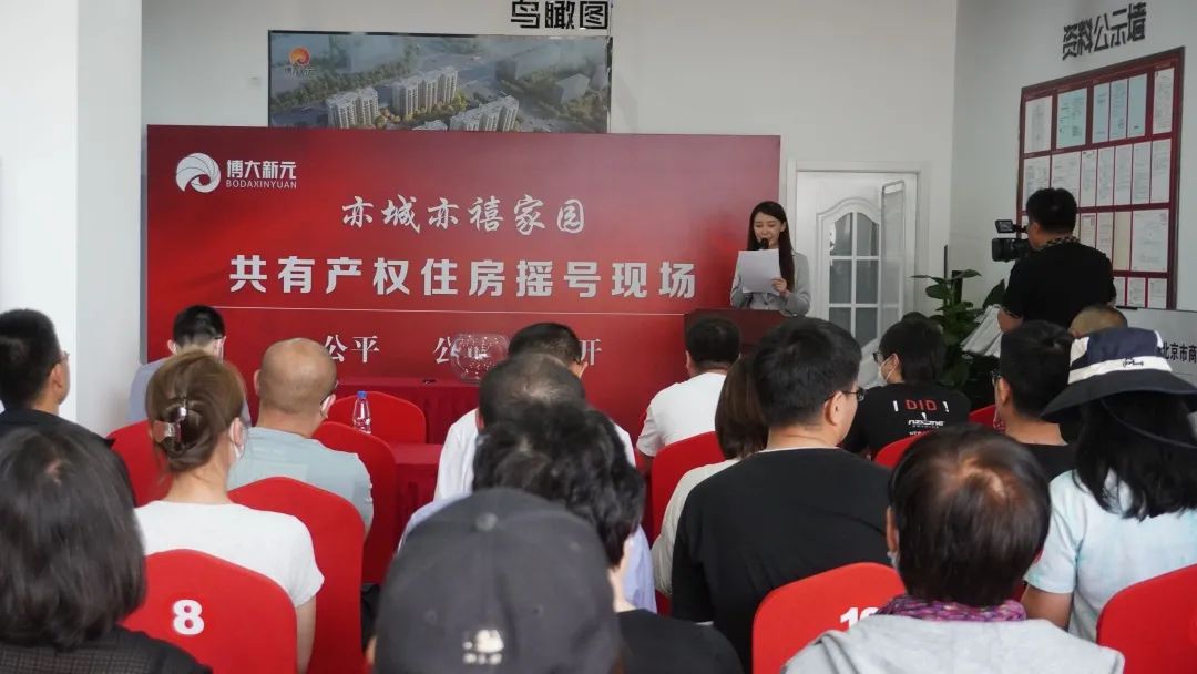 据现场工作人员介绍,该共有产权住房项目最终确认申购家庭4108户,经复核及公示后,最终取得本次摇号资格家庭为1110户。本次摇号活动由北京博大新元房地产开发有限公司组织与实施,北京市住房和城乡建设委员会、北京经开区开发建设局指导监督。摇号过程由北京市方圆公证处依法全程公证,并接受申购家庭代表、新闻媒体等到场监督。所有参加本次摇号的申购家庭代表,将通过电脑摇号系统,不分组别、一次性摇出所有申购家庭选房顺序号。