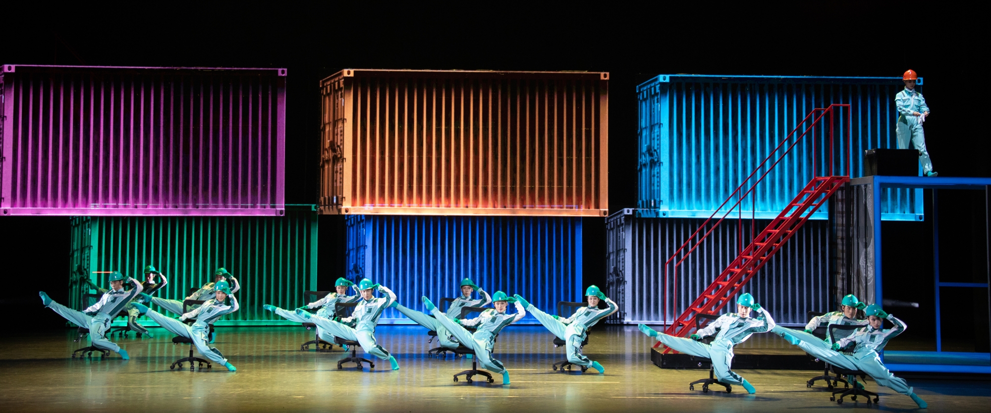 随后,科研技术人员潜心研发新系统、港口建设者日夜拼搏的火热画面陆续上演。在多媒体屏幕的背景下,高耸如林的桥吊繁忙作业,形态各异的运输车辆川流不息,五彩斑斓的集装箱层层堆砌,种种工作场面呈现在舞台上。目前国内关于工业题材的舞台作品并不多,但令人欣喜的是,《东方大港》将扛沙袋、打夯,以及操纵起重机、龙门吊等场景都被排成了舞蹈,演员们用肢体语言表现热火朝天的劳动场面,兼具力量感与美感。关于新系统研发的舞段则以“敲键盘”为主要动作元素,更多依靠演员们的腿部动作展现变化。