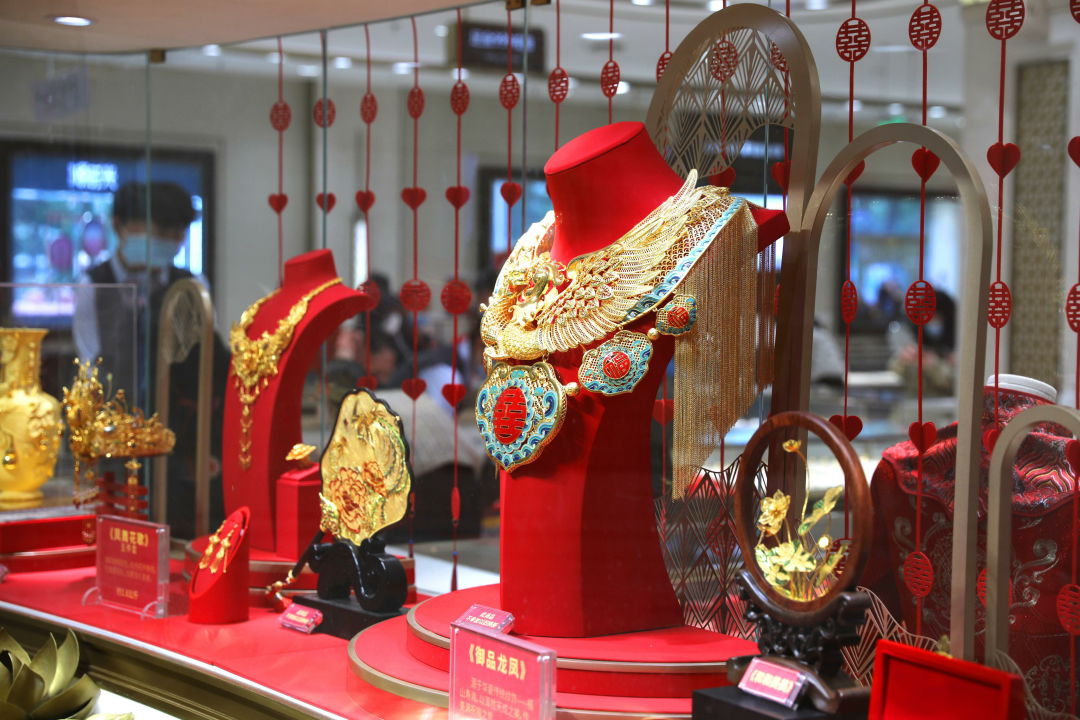 每年春节前夕,菜百自主设计的生肖转运珠的柜台人头攒动、持续热销,每日售出转运珠超万件。如今,随着婚庆市场需求释放,婚庆“刚需”的黄金珠宝消费需求随之上涨,菜百推出了“凤舞花歌”“喜上眉梢”等婚庆套装及子品牌“菜百悦时光”。