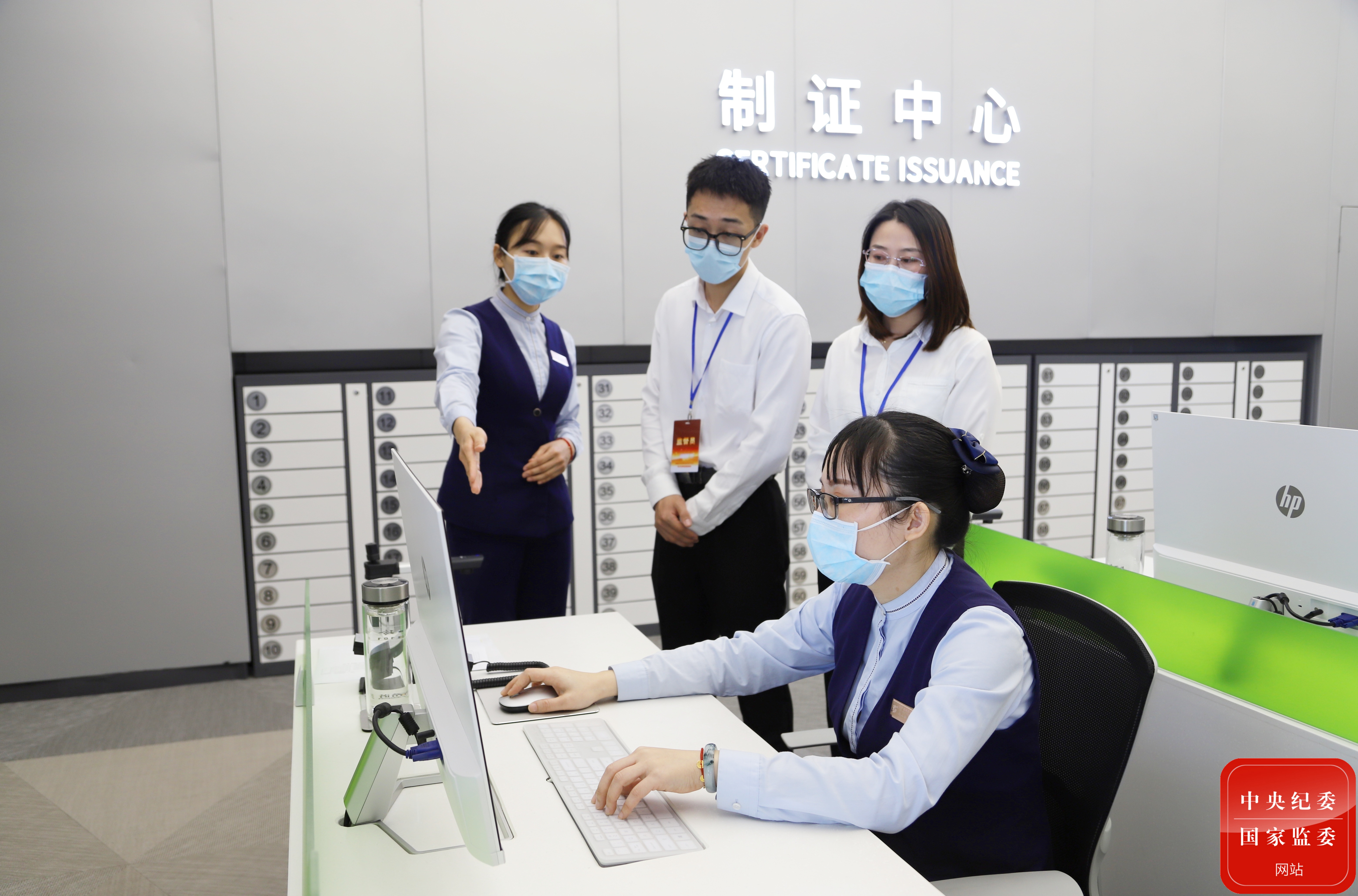 海南省海口市纪委监委扎实开展调查研究,切实解决工作中存在的卡点、堵点、难点等问题,营造良好的营商环境,助力自由贸易港建设。图为海口市龙华区纪检监察干部深入龙华区新政务大厅一楼制证中心,详细了解了制证中心的运作模式和流程。(海南省海口市纪委监委 吉曼妮 摄)