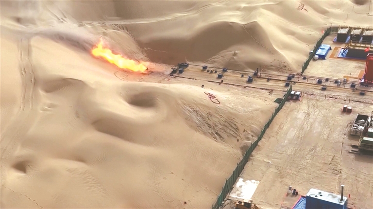 5月2日,顺北10斜井已经钻探完毕,井深8591米,正式放喷点火,测试这口井是否有油气流。(视频截图) 图片来源:视觉中国