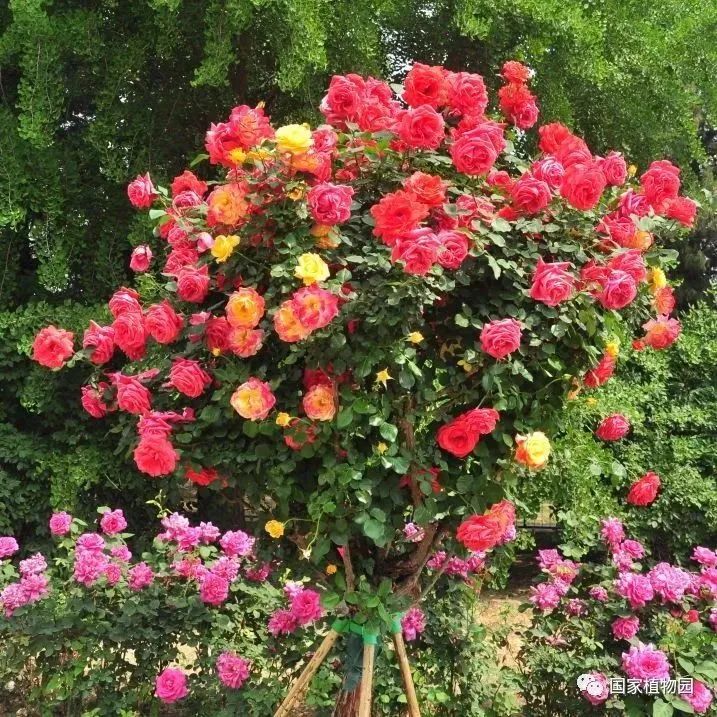 有些树状月季上嫁接了两个品种,可以让我们在“一株树”上欣赏到多种月季花,具有很好的观赏性。