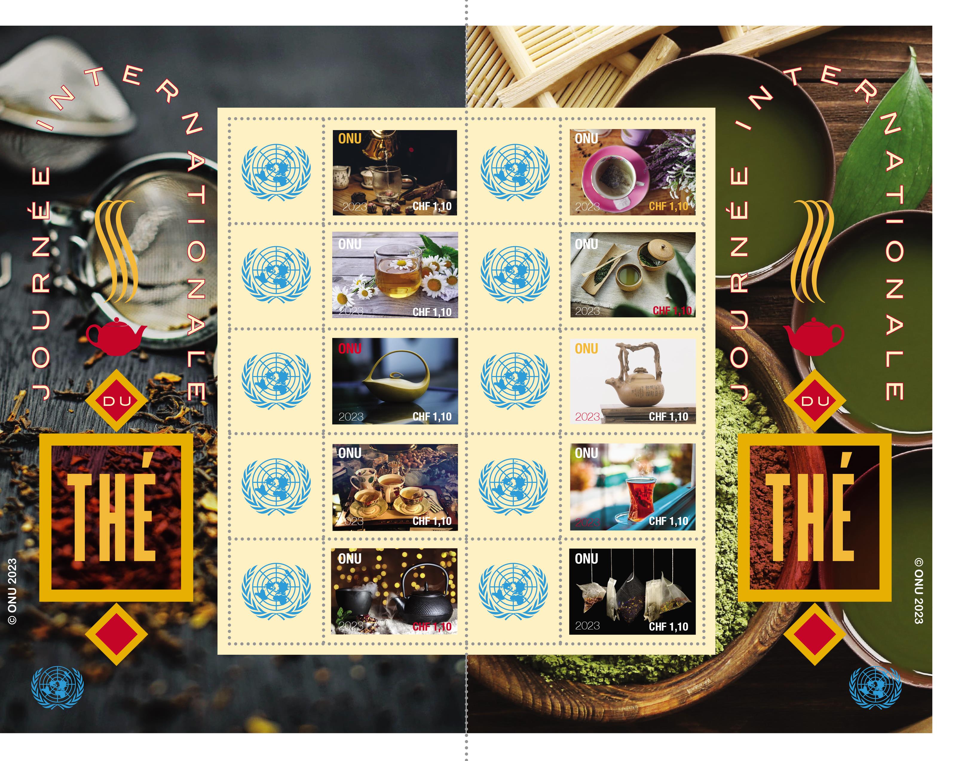 “国际茶日”邮票一套10枚,6枚为茶叶,4枚为茶器。茶器邮票中2枚为紫砂壶,一件是清末民国制壶大家范大生1926年制作的“东坡提梁壶”,一件是当代制壶名家范伟群的“无相壶”。邮票面值为1.10瑞士法郎,附票为联合国徽章图案,由联合国邮政的平面设计师瑟吉尔·巴拉达特设计。这也是联合国首次发行以茶叶为主题的邮票。