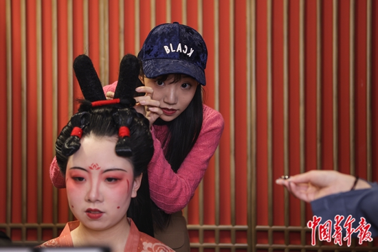 2021年3月9日,北京三里屯,1992年出生的韩爽(右)在自己的汉服体验馆里录制《唐宫夜宴》仿妆教程视频。中青报·中青网记者 曲俊燕/摄