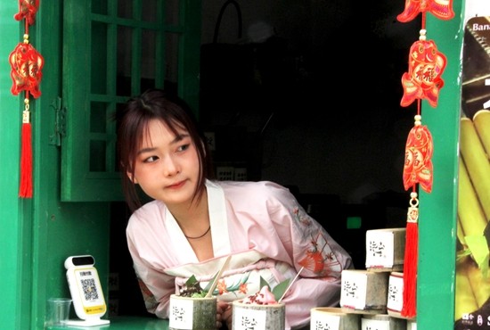 5月10日,山东济宁环西北里文创街区,20岁的店员佳芯身着华服在竹筒冰淇凌店里等待顾客。近年来,山东济宁对优秀传统文化进行持续创造性转化、创新性发展,全力打造文化“两创”先行示范区,许多年轻人在其中获得了发展的空间和机遇。视觉中国供图