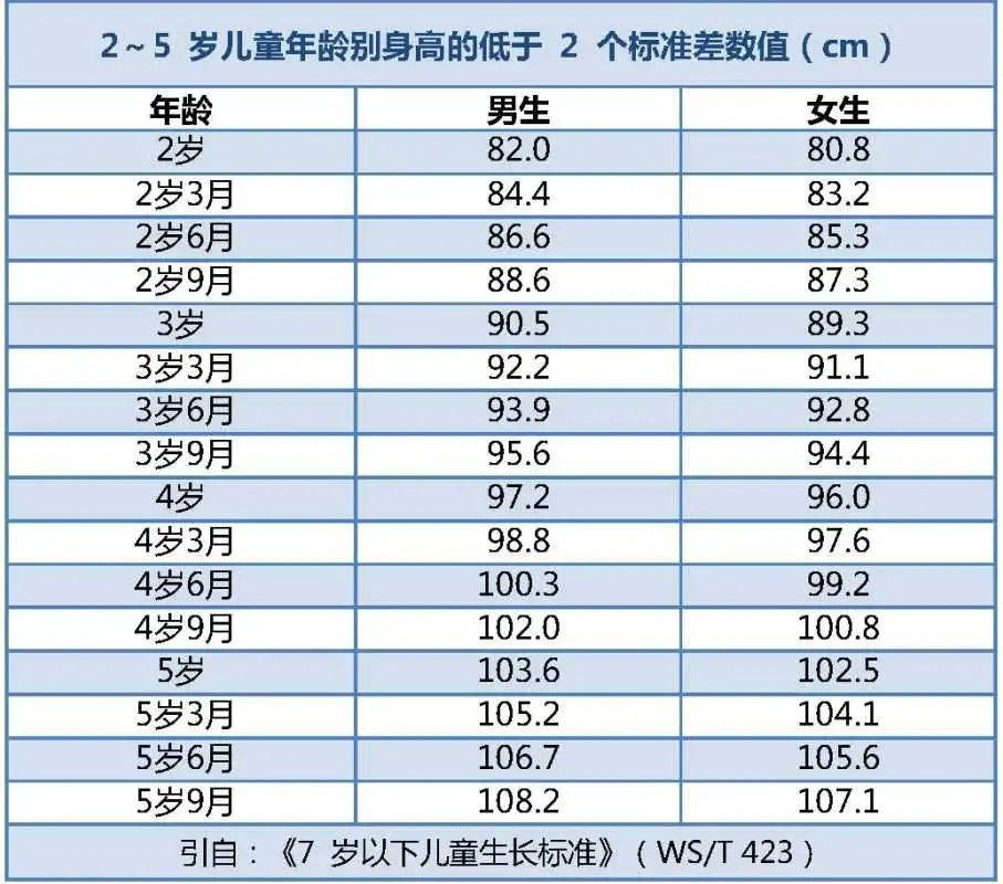2~5岁儿童身高低于同年龄、同性别儿童身高2个标准差,6~17岁儿童青少年身高小于或等于相应年龄组、性别 、生长迟缓界值范围则判定为生长迟缓,详见下表。