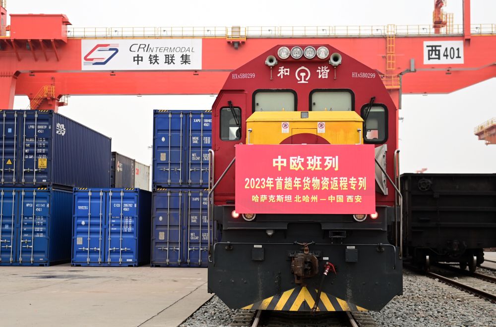 满载着来自哈萨克斯坦1300吨面粉的中欧班列抵达西安国际港站(1月13日摄)。新华社记者 李一博 摄