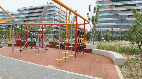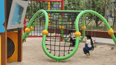 区园林绿化局对公园的儿童活动区安装了一些爬网、摇摇椅、秋千还有沙子坑。“我们对沙子区建设的标准是非常高的,”米振刚告诉记者:“这里的沙子都采用经过处理的海沙,让小朋友有一种在海边挖沙子的感觉。”