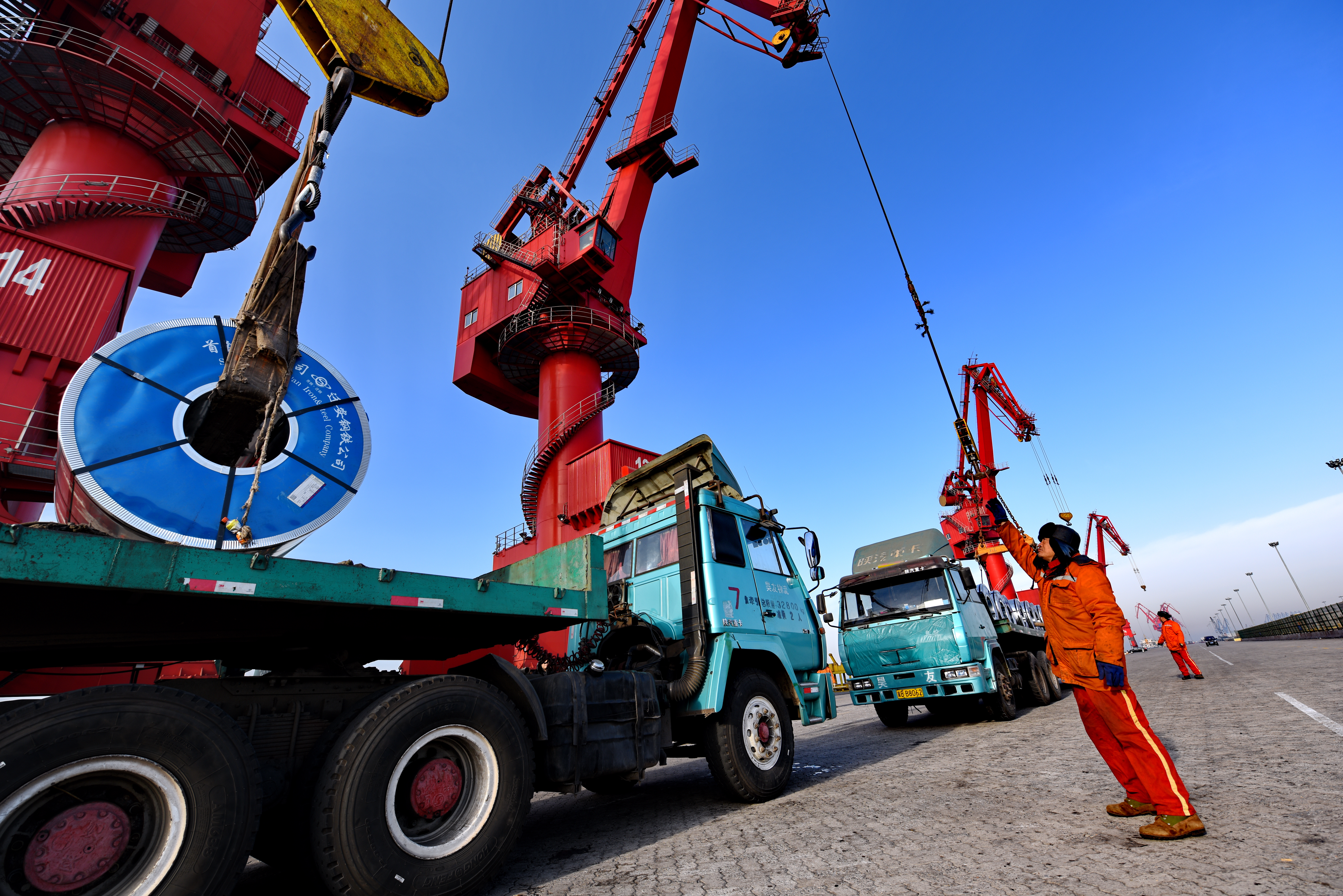 曹妃甸港区水深港阔,为国际货轮提供了天然的靠泊条件。来自五湖四海的货船踏浪而来,载满出口钢材的货船起航驶向远方。作为入驻曹妃甸的首家龙头企业,首钢京唐带动北京生产性服务业转移到此,与钢铁业下游形成产业链,推动曹妃甸矿石港、原油港、煤炭港等港口群建设,在京津冀协同发展的潮头,勇当先锋。