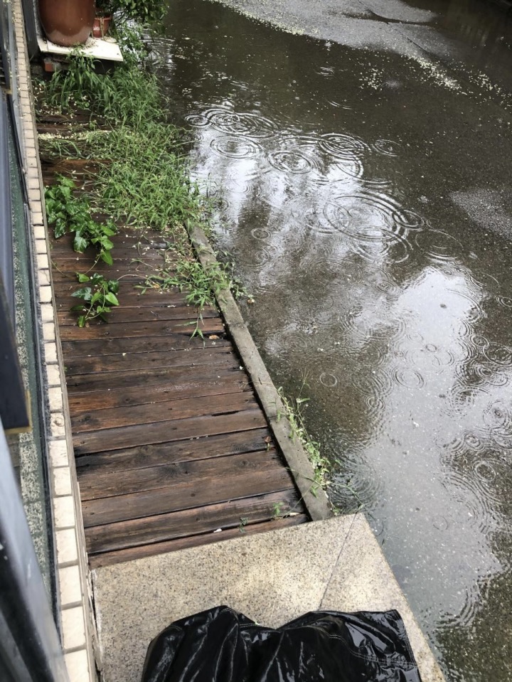 住在一层的居民介绍,当初修路时,楼门外有段路没有找平,比周围低了20厘米左右,一到下雨,就会积水,尤其是最近三年,下雨时积水越来越严重。