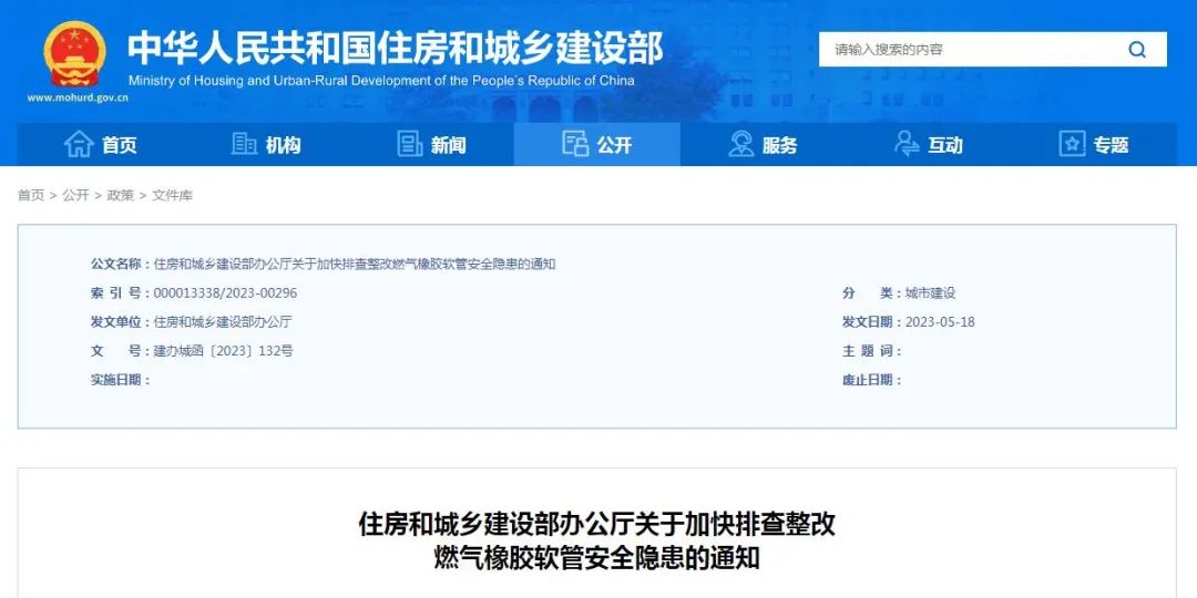 近日,住房和城乡建设部办公厅印发《关于加快排查整改燃气橡胶软管安全隐患的通知》指出,近年来,橡胶软管老化、受损等导致燃气泄漏引发的安全事故屡有发生,严重威胁人民群众生命和财产安全。要坚持人民至上、预防为先,清醒认识城市燃气安全面临的严峻形势,深刻吸取事故教训,举一反三,全面落实《城市燃气管道等老化更新改造实施方案(2022—2025年)》《全国重大事故隐患专项排查整治2023行动总体方案》等部署要求,加快排查整改燃气橡胶软管安全隐患,切实维护人民群众生命财产安全。