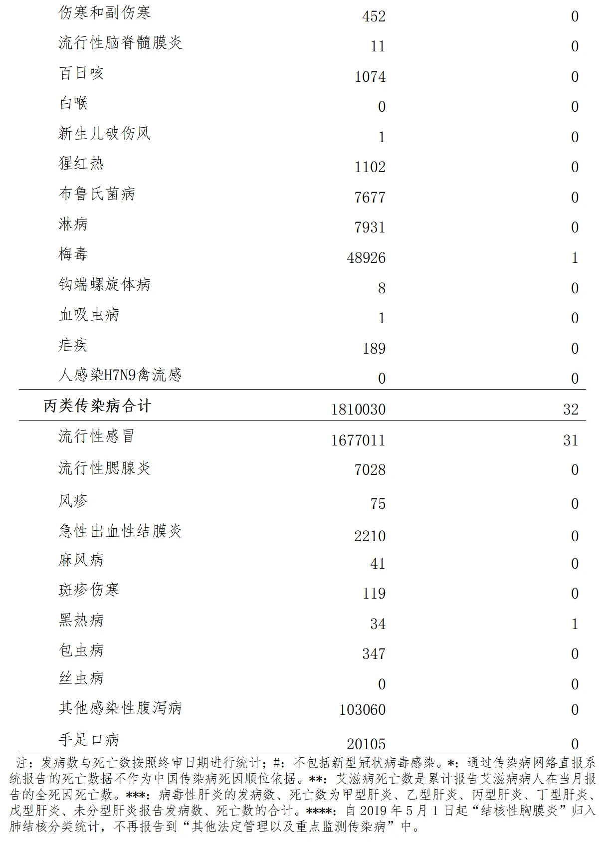 同期,丙类传染病共报告发病1810030例,报告死亡32人。报告发病数居前3位的病种依次为流行性感冒、其他感染性腹泻病和手足口病,占丙类传染病报告病例总数的99.5%。