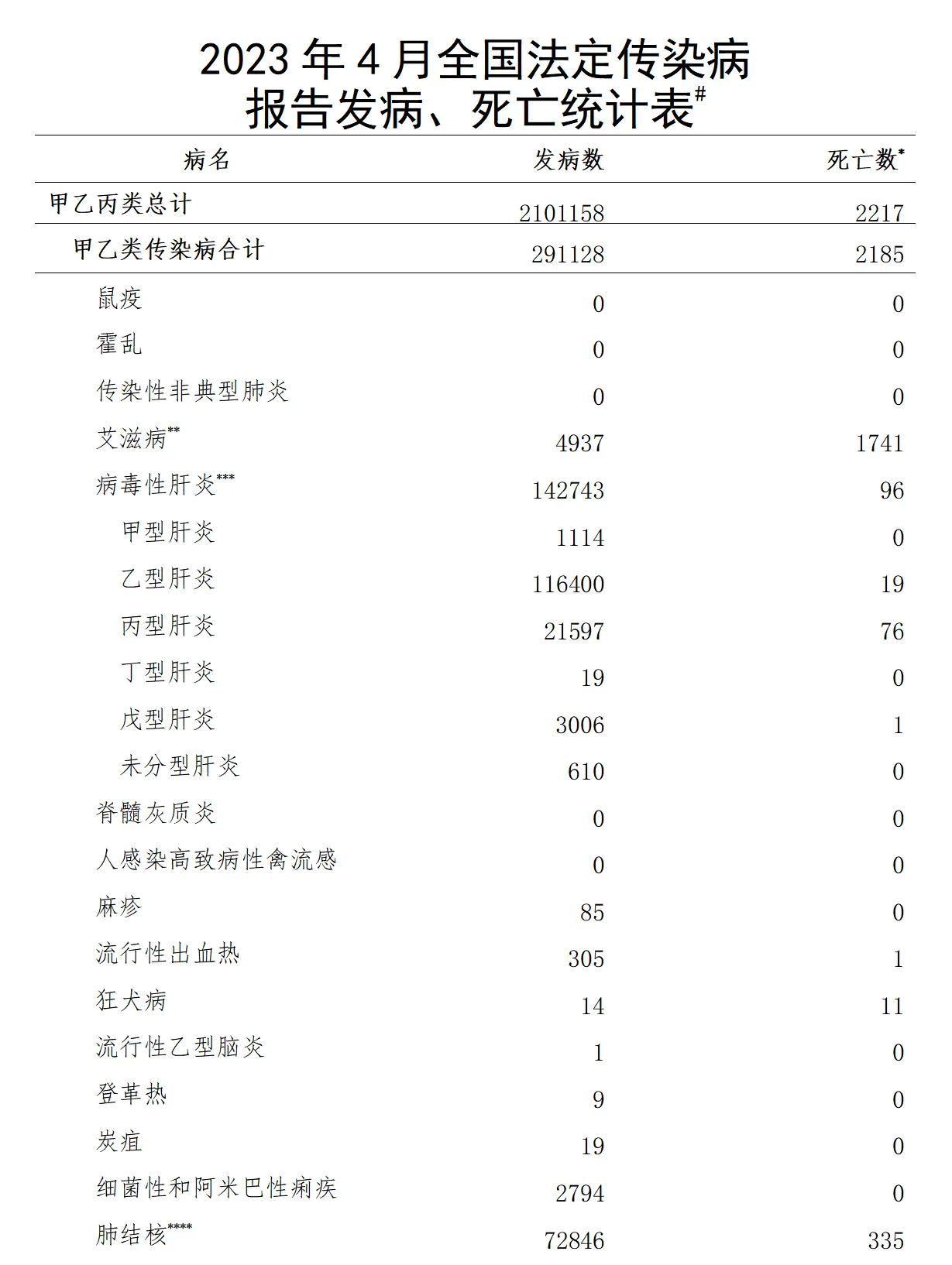 5月25日,国家疾控局发布2023年4月全国法定传染病疫情概况。2023年4月1日0时至4月30日24时,全国(不含香港、澳门特别行政区和台湾地区)共报告法定传染病2101158例,死亡2217人。甲类传染病无发病、死亡病例报告。
