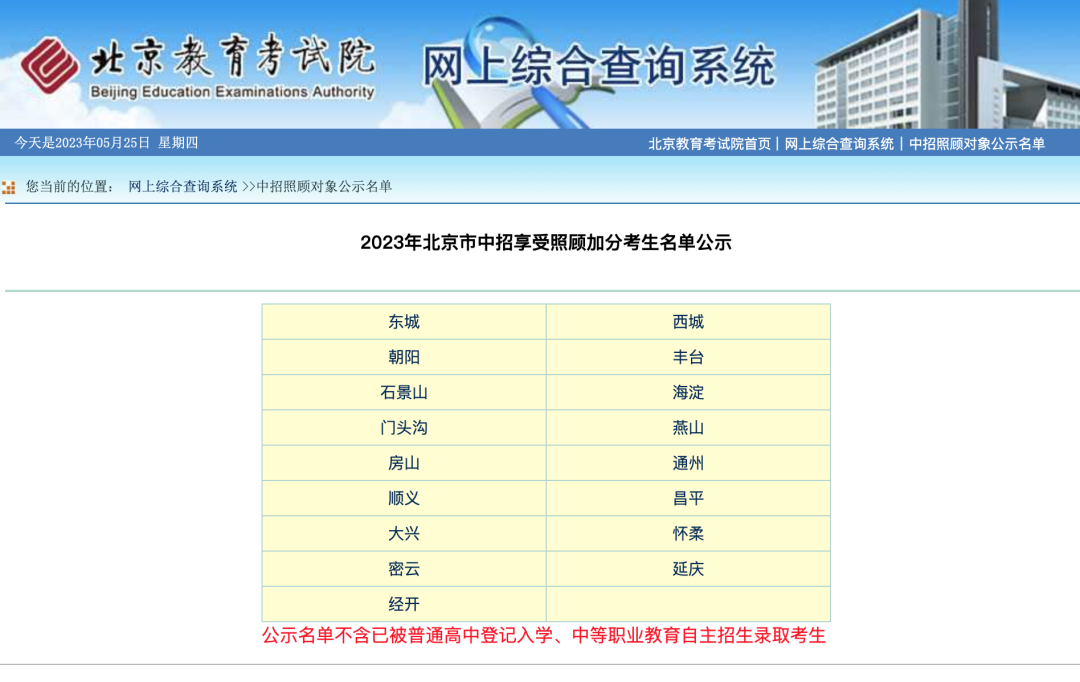 北京教育考试院今天公示2023年北京市中招享受照顾加分考生名单,符合有关加分和优先录取规定的考生可登录北京教育考试院网站查询。值得提醒考生的是,此次公示名单不含已被普通高中登记入学、中等职业教育自主招生录取考生。