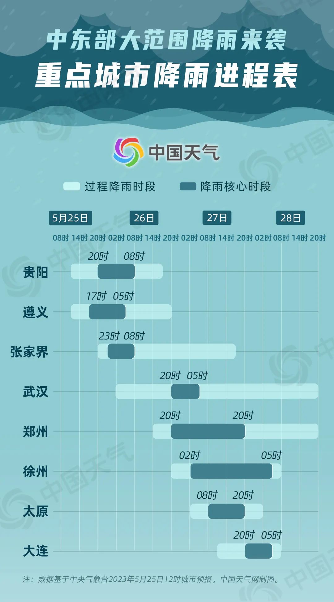 今天(5月25日)一直到本周末,中东部将迎大范围较强降雨过程,或波及河南、山东、湖北等18省区市,局地可能出现暴雨。中国天气网推出重点城市降雨进程表,快来看看你家何时降雨最强。