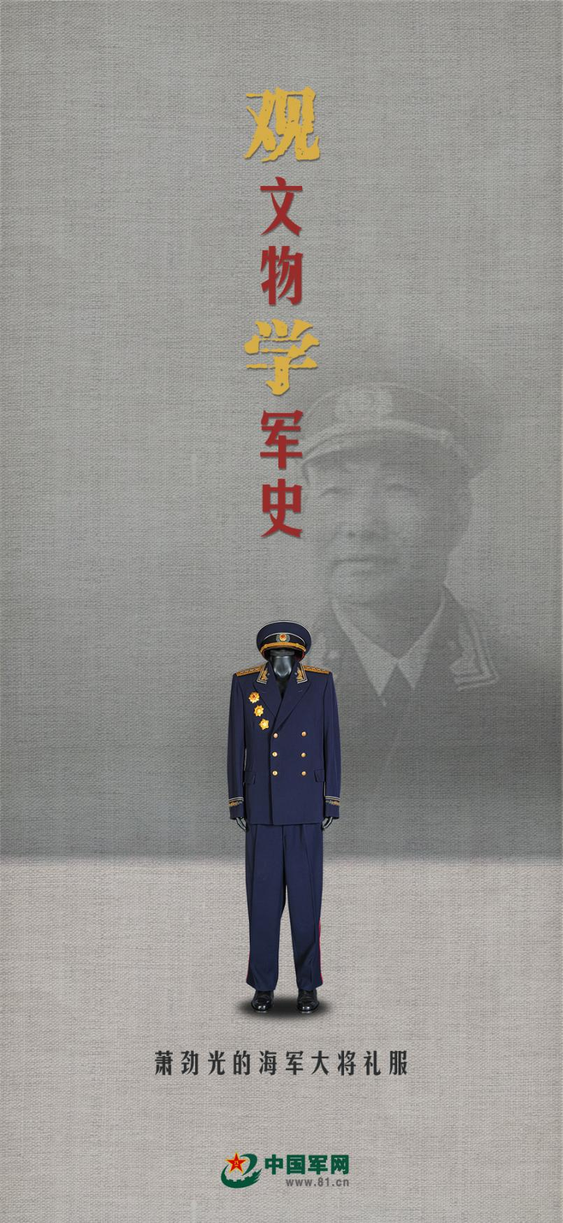 在中国人民解放军海军博物馆展厅内,陈列着一件极其珍贵的礼服,它是海军唯一的一件大将礼服,而它的主人正是海军第一任司令员萧劲光大将。该礼服为1955年萧劲光被授予海军大将军衔时所穿着。