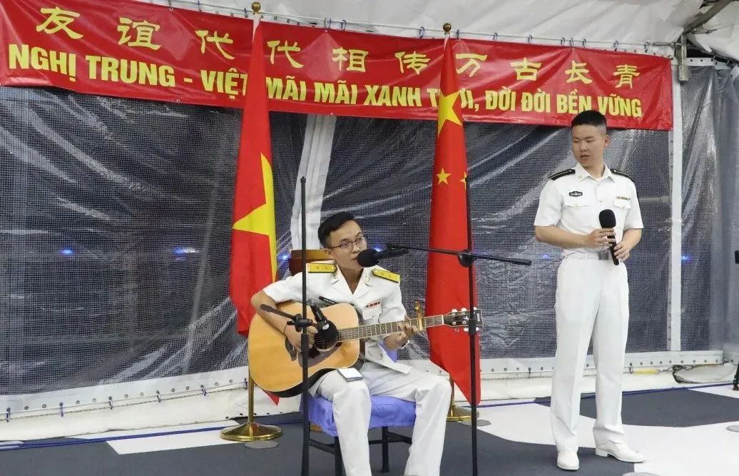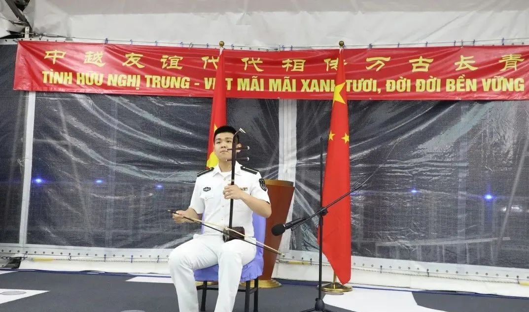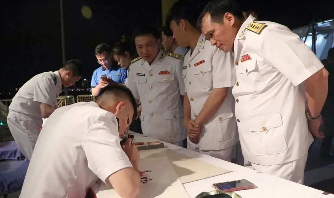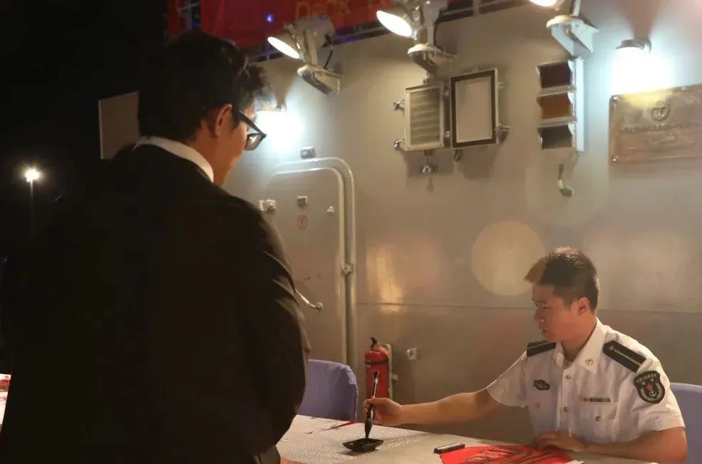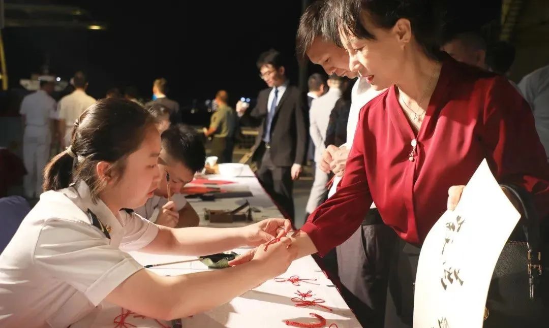 5月24日晚,戚继光舰点亮满灯,举行盛大的甲板招待会,中越双方近200人出席。戚继光舰在甲板上设置了中国传统文化展示区,学员代表进行编绳、书法、茶艺等传统文化展演。招待会上,中方官兵为宾客带来二胡、竹笛等民乐表演。越方海军官兵现场即兴邀请中方学员合唱了歌曲。
