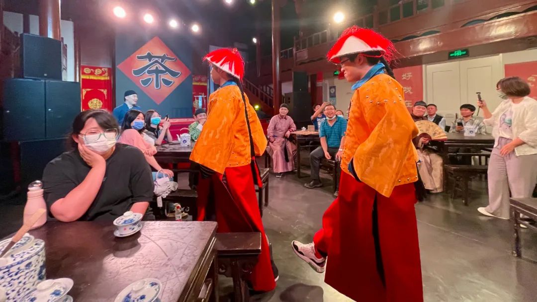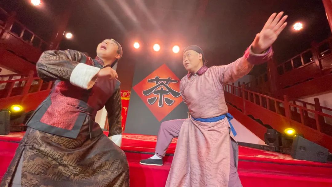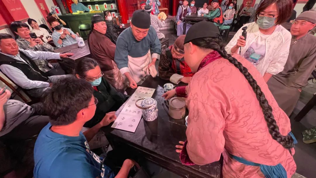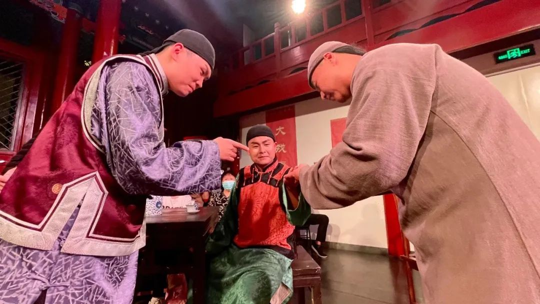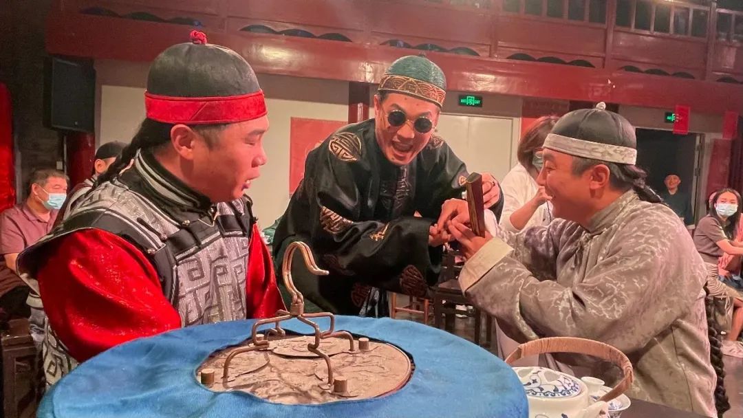在颜料会馆戏楼,几张方桌错落摆放,观众在店小二的引导下有序落座。当您还疑惑演出将如何展开,殊不知,好戏已经开场,您已经是茶馆里的“茶客”了。一群穿着旗装、留着辫子的八旗子弟或提笼架鸟,或手握文玩核桃,端着爷的架子,径直朝您走来。然后,冷不防坐在离您咫尺的位置,要共享一壶好茶了。