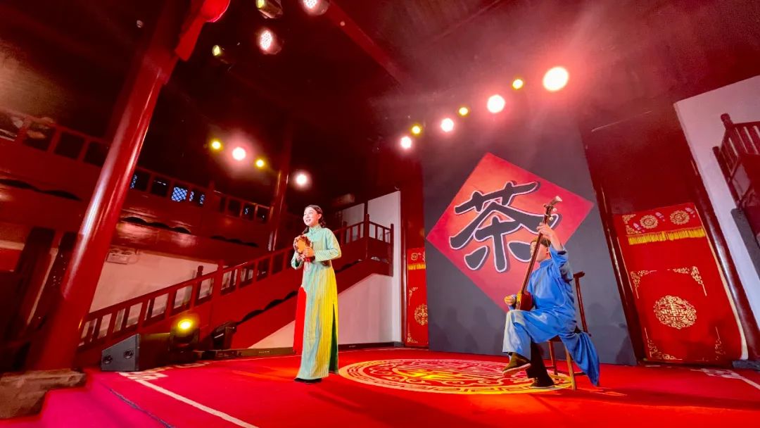 演出打破传统舞台表演形式,以“融戏于景、戏景相融”的全新形式呈现。观众以茶馆“顾客”的身份参与整场表演,与演员一同置身演出场景之中,极强的代入感、参与感、互动性,调动着观众的多重感官,带来融入剧情、投射情感的新型入口。