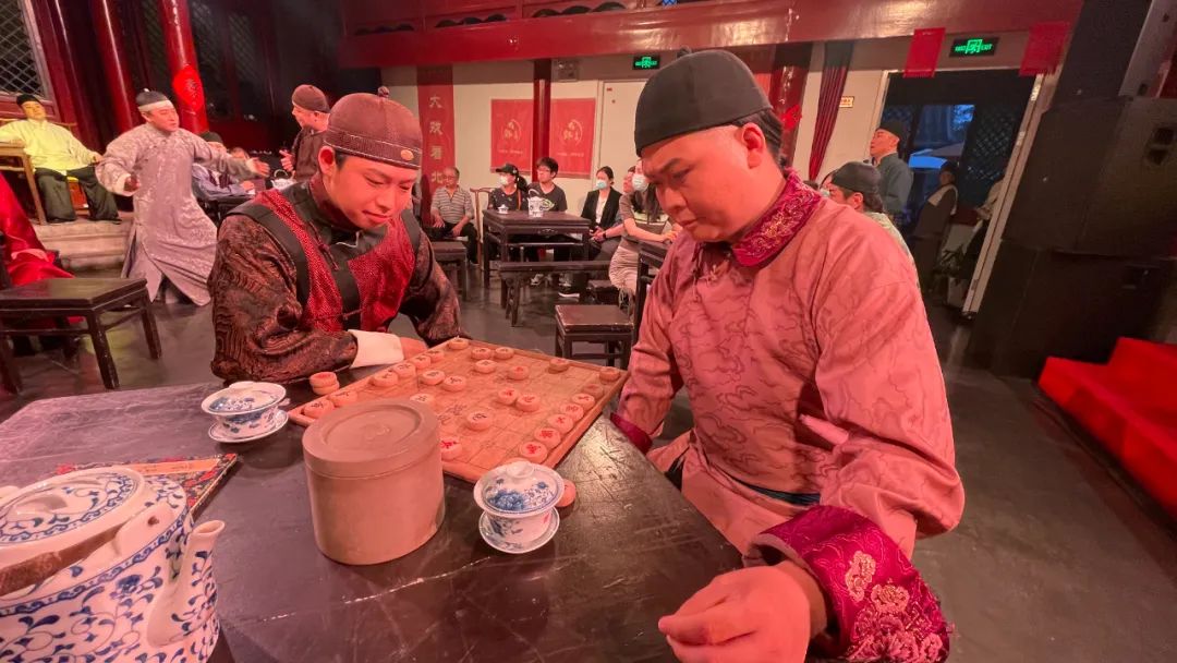 往常在舞台上听得着、喝不着,现在,来颜料会馆看北京曲剧沉浸式《茶馆》演出,观众不仅可以听曲儿喝茶、当一回戏中人,出门来还能赏一番胡同风光、尝一尝悦合颜新京菜,再惬意不过。