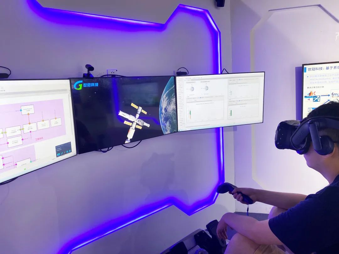 智能制造板块,中关村科学城聚焦工业软件、机器人、智能检测装备等细分领域,北京世冠金洋科技发展有限公司展出了完全自主研发的国产工业软件GCAir,可提供空间站发射全过程仿真交互场景VR视景体验。
