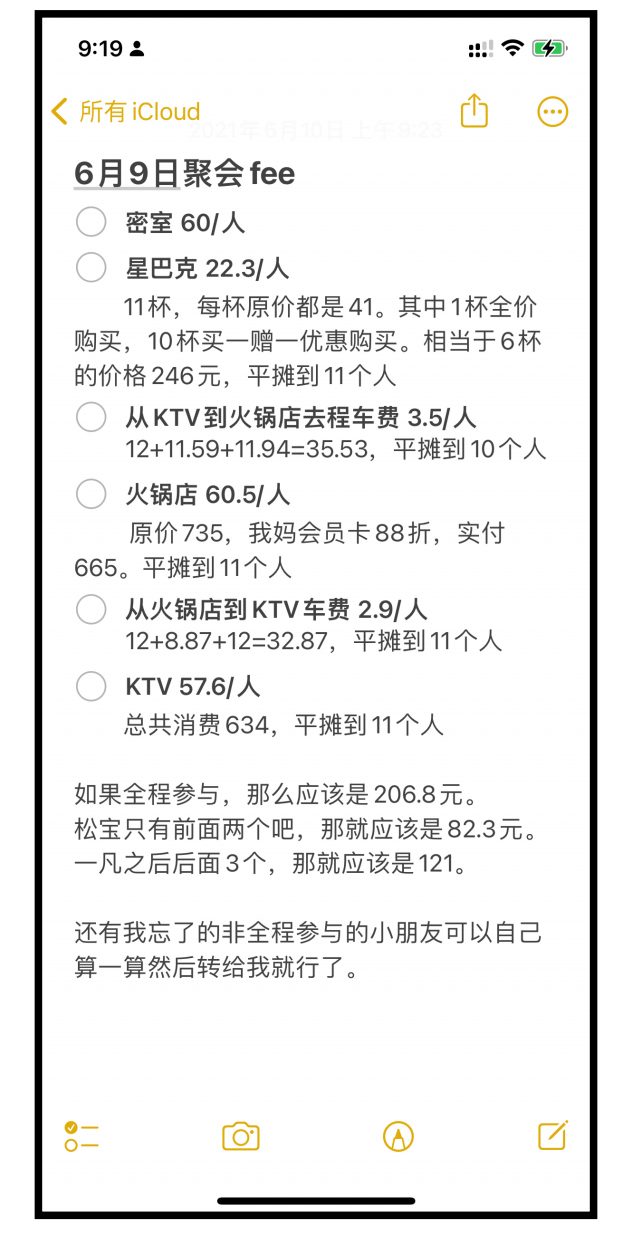 按何正浩说,⾼考完的第⼆天,他和同学聚会,各种各样的⽀出项⽬,如密室逃脱、KTV、饮料、火锅等,都是由他先代付的。“凌晨,我在回家的路上打开备忘录,计算我应该向每位同学收取多少钱。由于不是每个同学都全程参与了,这个计算过程⾮常麻烦,需要在计算器和备忘录之间不停切换。”