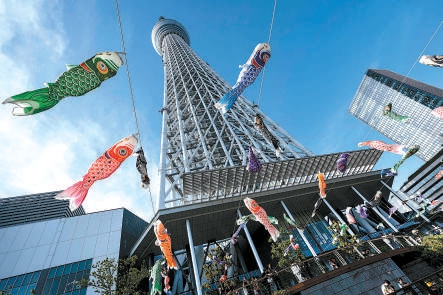 东京“天空树”下飘扬着各色鲤鱼旗纪念儿童节。