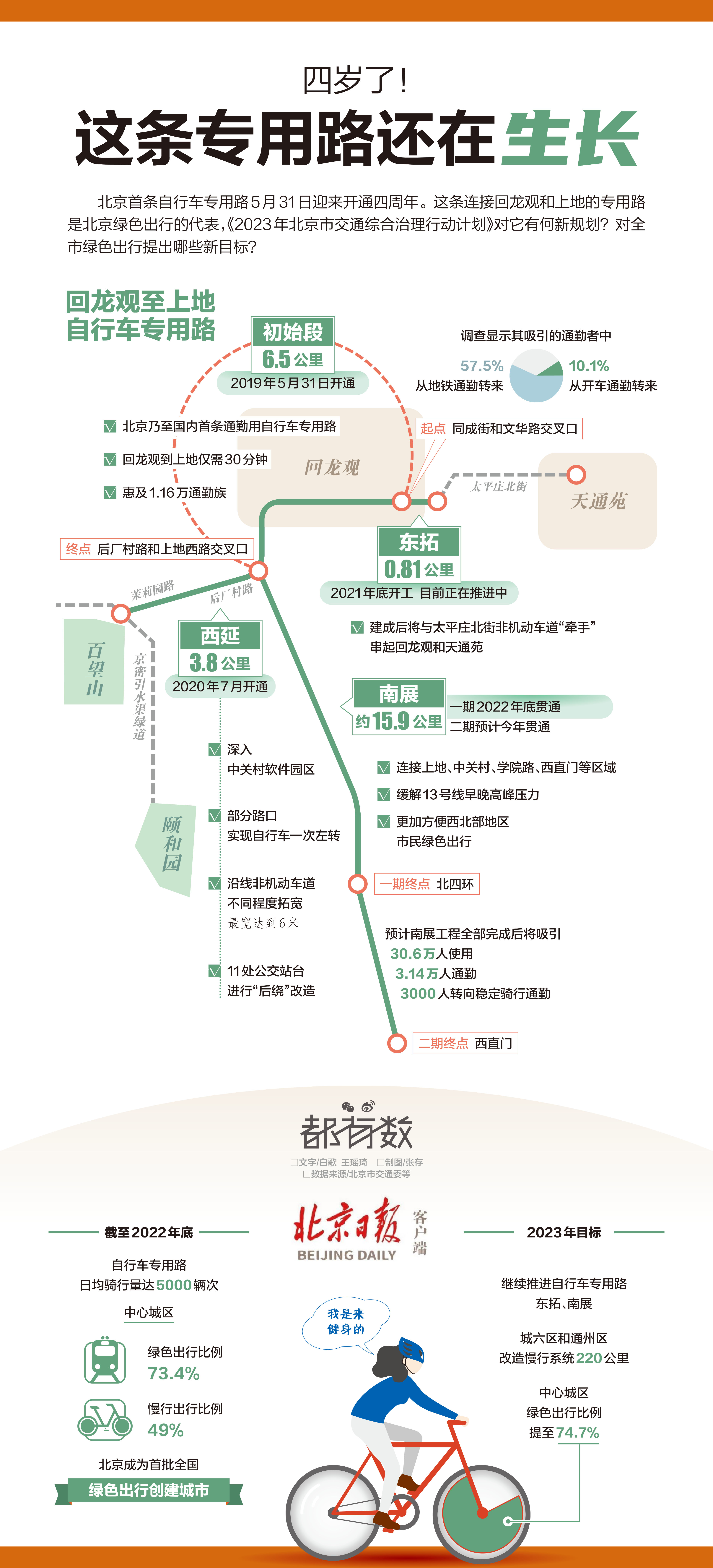 北京首条自行车专用路5月31日迎来开通四周年。这条连接回龙观和上地的专用路是北京绿色出行的代表,《2023年北京市交通综合治理行动计划》对它有何新规划?对全市绿色出行提出哪些新目标?