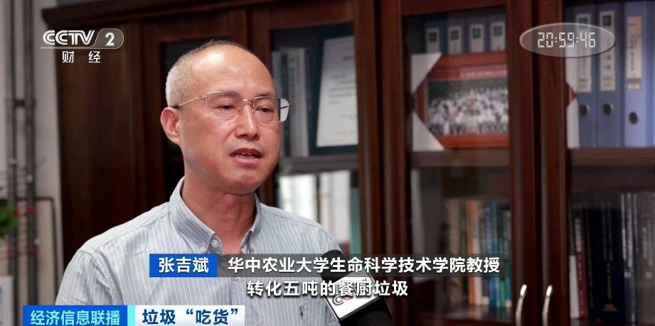 华中农业大学生命科学技术学院教授 张吉斌:转化5吨的餐厨垃圾,可以产生1吨的鲜虫,产生大概2吨左右的昆虫虫肥,实现零排放,而且把它变废为宝,可以实现绿色循环的产业链。