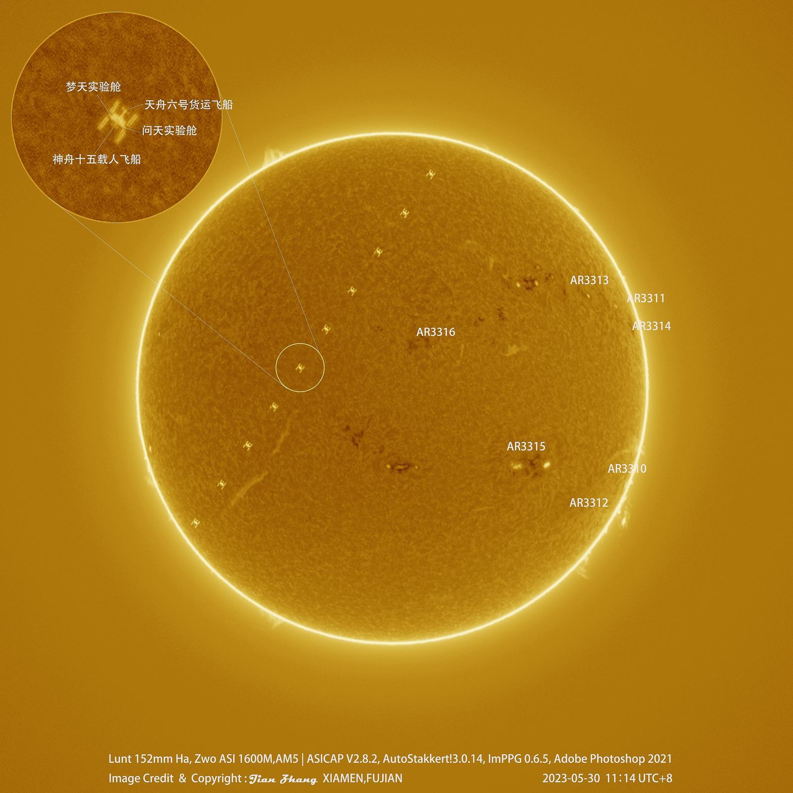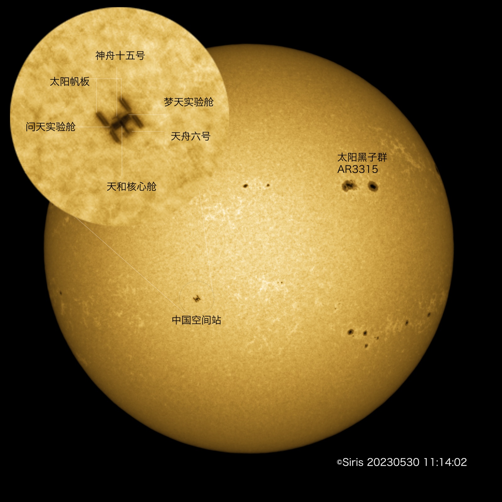 因为需要对接30日成功发射的神舟十六号飞船,本次中国空间站经过日面时,与观测点仅398.8km,投下的剪影“个头”较大,三舱两船(天和核心舱、问天实验舱、梦天实验舱、神舟十五号、天舟六号)的构型清晰可见,甚至可以看清太阳帆板间的缝隙。中国空间站视大小尺寸达20角秒,“个头”较大。