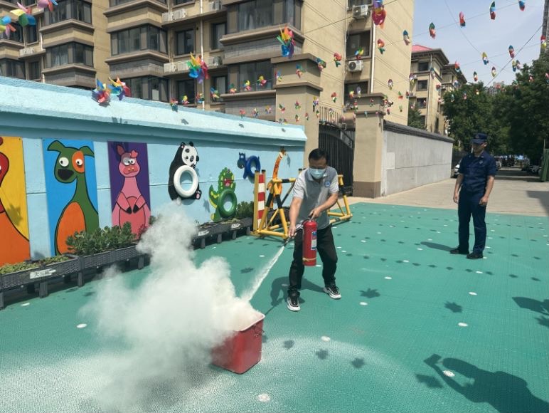 “叔叔,你是太空人吗?”“小朋友,我穿的是隔热服。”在西罗园街道的育百德幼儿园,孩子们围着身着隔热服的消防员好奇地问着。西罗园消防救援站的一车五人来到这里后,先是组织师生们来了一场“说走就走”的消防演练,随着急促的警报声突然响起,消防安全疏散演练拉开序幕,全园师生迅速反应,各班幼儿在老师引导下,用湿毛巾捂住口鼻,弯腰低姿沿着指定疏散逃生路线迅速地从教室撤离到户外操场,全园幼儿秩序井然。随后,小朋友们通过看一看、听一听、摸一摸,更真切、更全面地了解了消防器材,在开阔眼界的同时学习了消防知识,提升了消防安全意识。小朋友们收到了儿童节“礼物”,老师们也有份,消防员现场手把手为教职员工讲解灭火器的使用方法,并开展“一警六员”消防基本技能实操实训,用“灭真火”的方式,强化他们学到的知识。