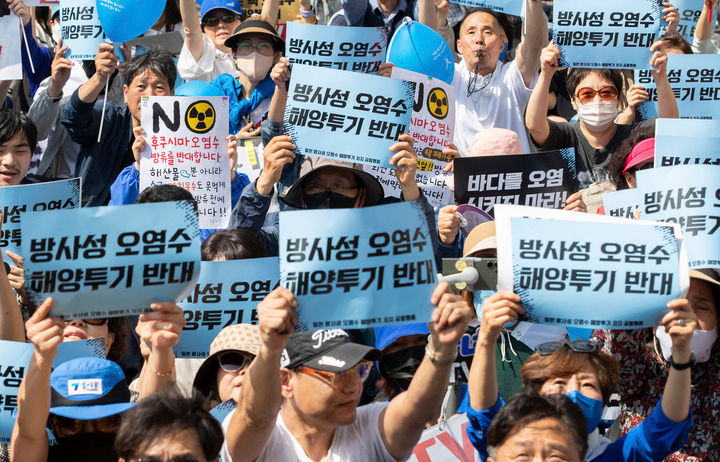 5月20日,韩国多个市民团体在首尔市中心举行集会,强烈反对日本政府将福岛核污染水排入大海计划。新华社发(李相浩摄)