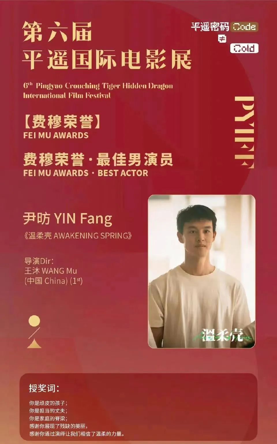 《温柔壳》帮助尹昉获得了2023年第六届平遥国际影展的“费穆荣誉·最佳男演员”奖,这让他很开心,不过他对自己未来的表演也提出了更高的要求,“作为一名演员,我希望未来能够在真实再现生活之上,通过表演形式上的探索,去超越生活和文本,能够在艺术语言本质里去到一个新的时空,从而达到一个更加广阔的境界。”