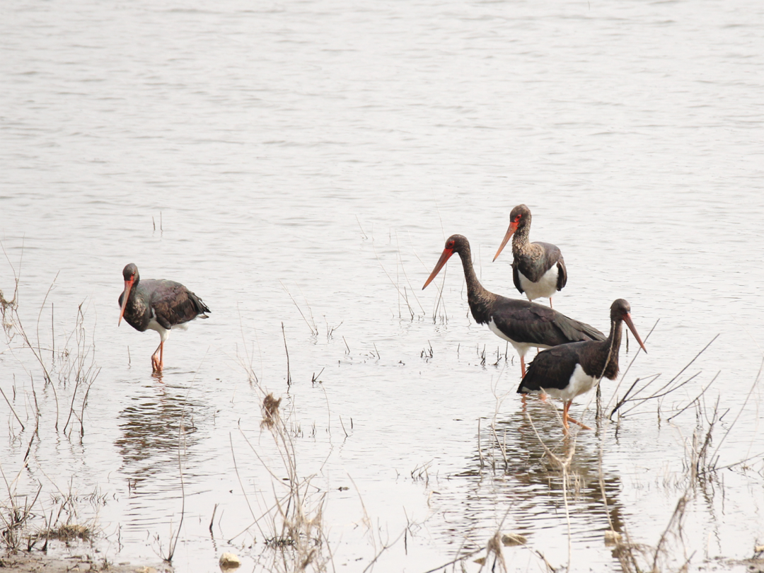 黑鹳与灰鹳在浅滩处,或觅食或漫步。