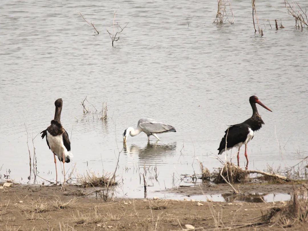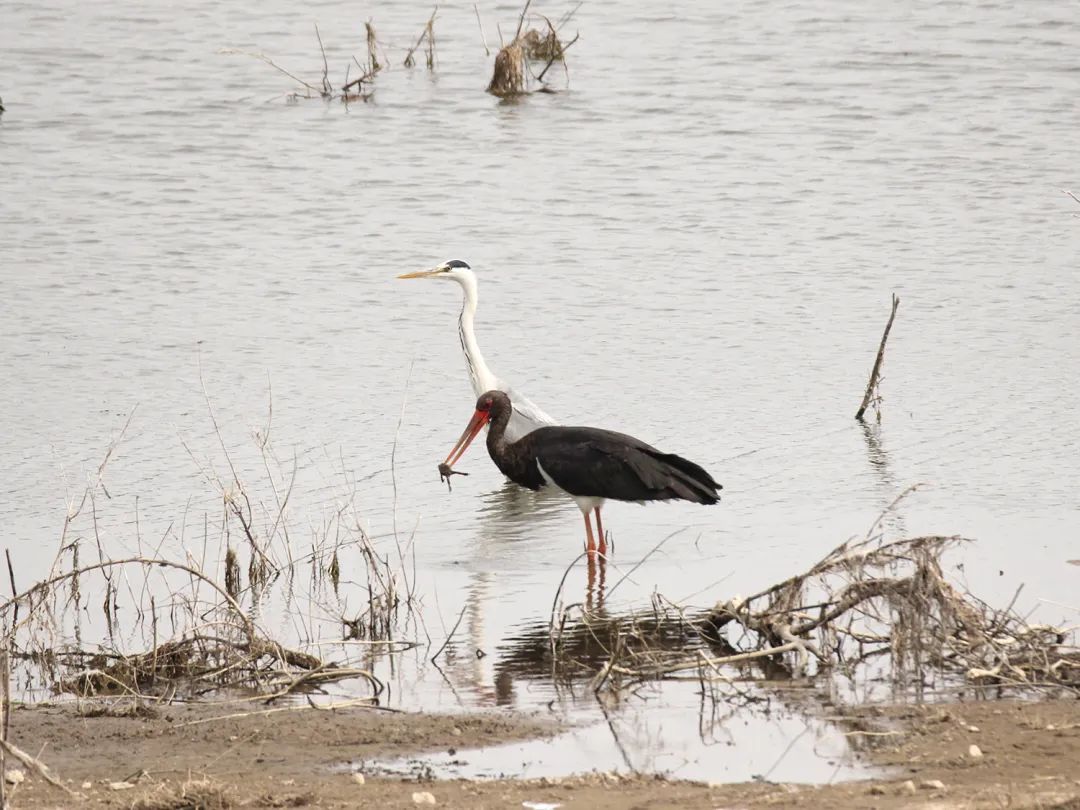 在翻看工作人员拍下的照片时,记者看到其中一张照片非常灵动,抓拍的是黑鹳嘴里叼着刚刚觅食到的一只蛙类。还有几张照片里,一个特殊的身影引人注意,它们体型跟黑鹳相似,但头顶中央和颈呈白色,头顶两侧是黑色,前颈中部有纵行黑斑,双翼、背部至尾部是灰色。翻阅网上资料,与之对比,工作人员猜测这是灰鹳,是国家二级保护鸟类。这也许就是黑鹳带来的新朋友吧,它们一起在唐指山水库漫步、觅食、嬉戏,悠闲自得。