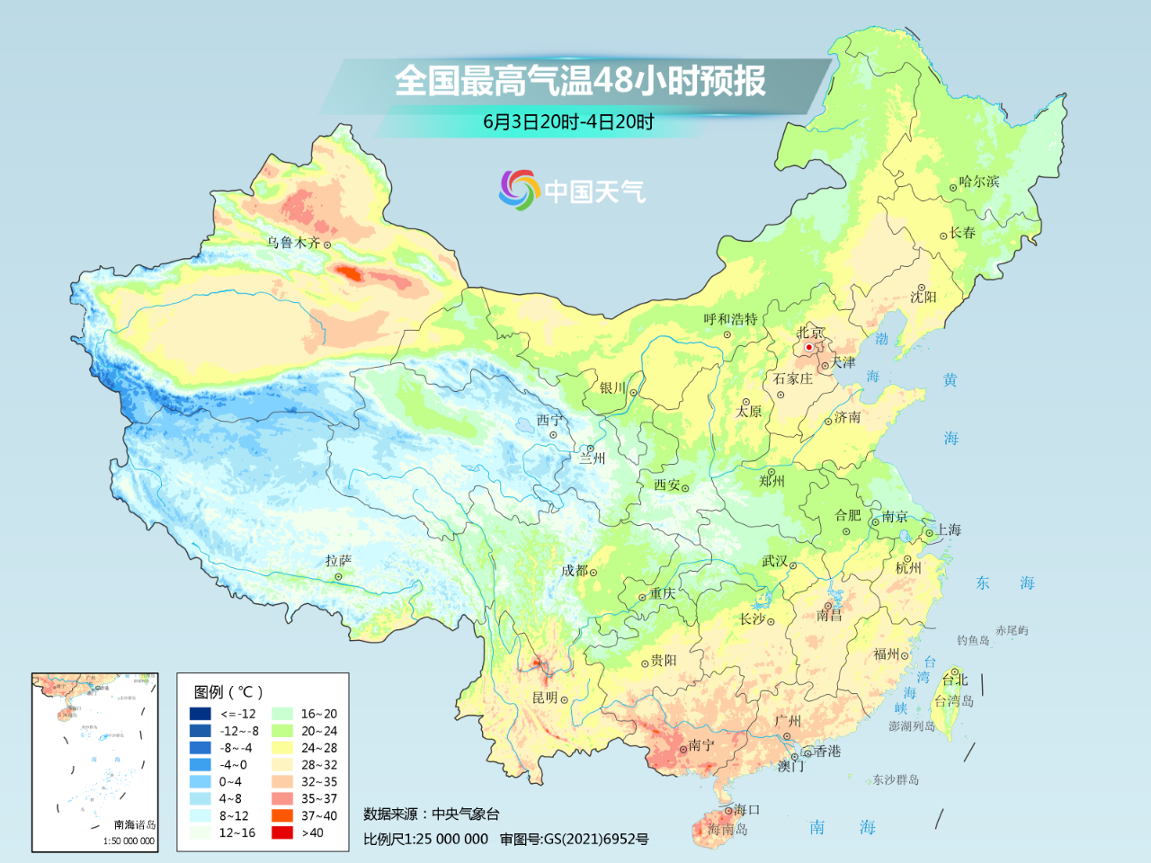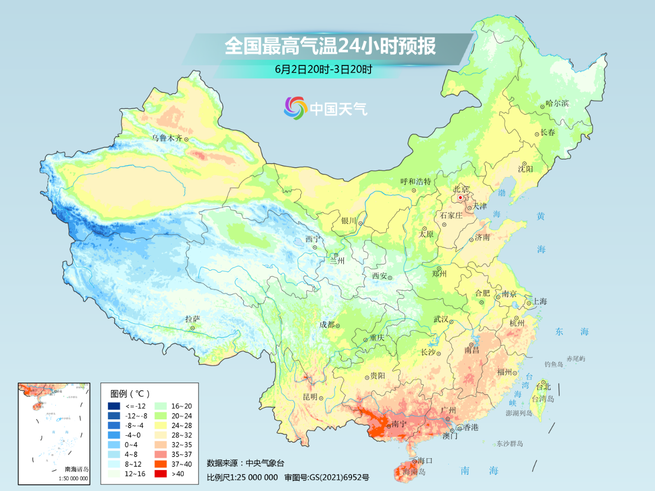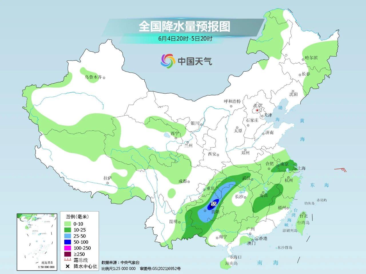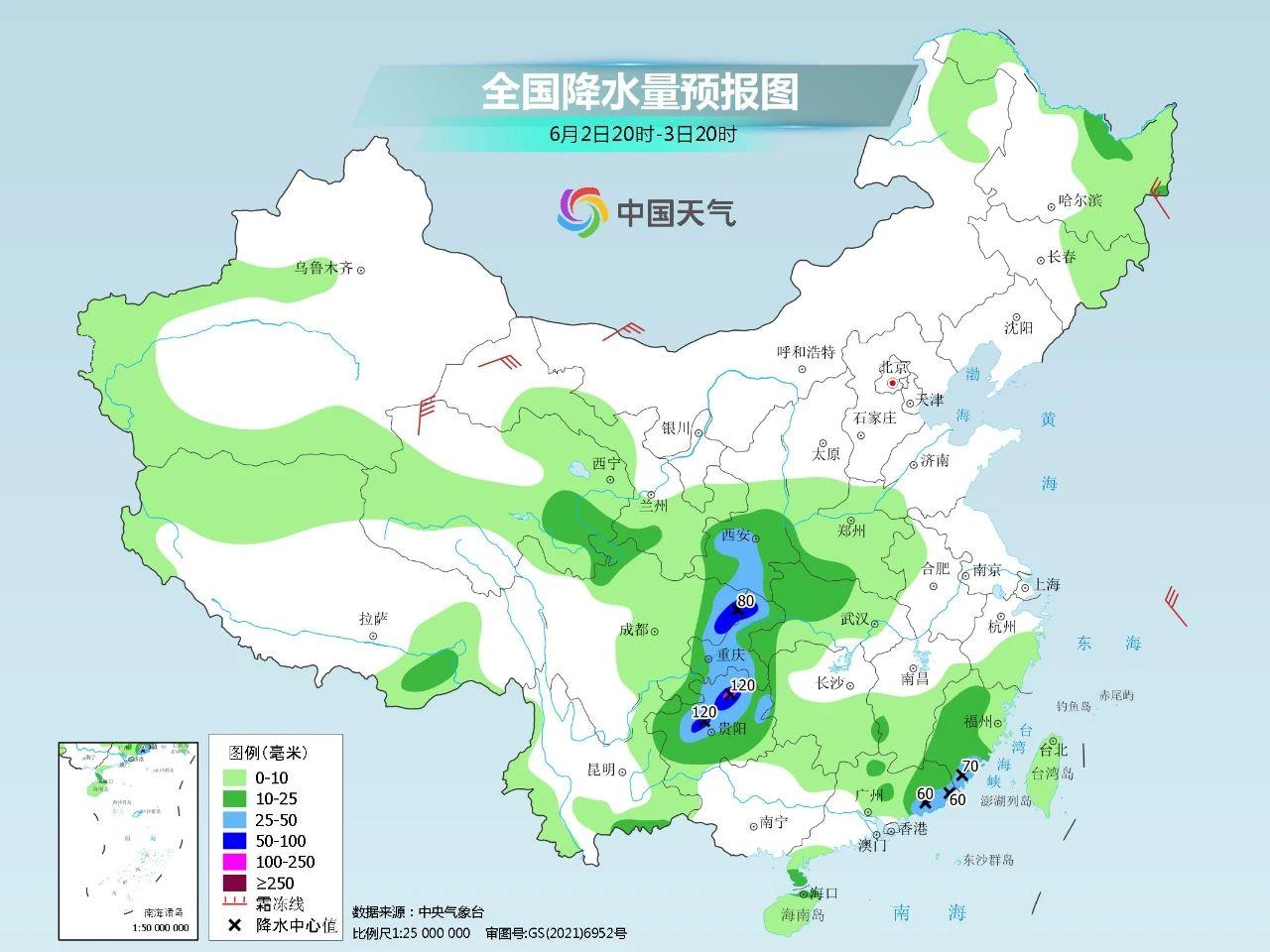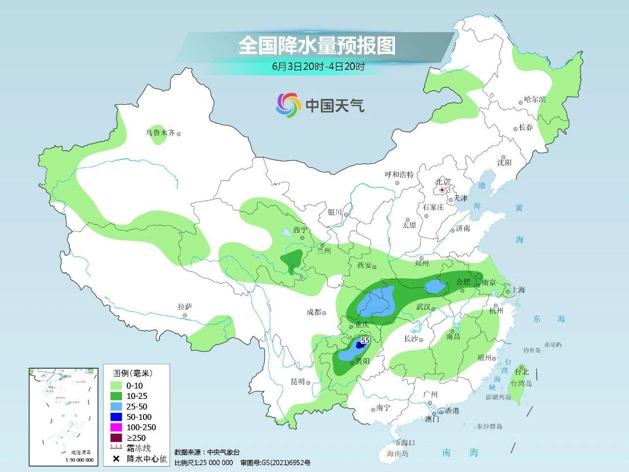 中央气象台预计,2日夜间至4日,青海东南部、陕西南部、四川东部、重庆、贵州、湖北西部、河南西南部、安徽中北部、江苏中南部、广东东部等地部分地区将有中到大雨,局地有暴雨或大暴雨,最大小时雨量20~40毫米,局地可达50毫米以上;吉林东部、福建西部、贵州西部、云南东北部等地的局地将有雷暴大风或冰雹天气。